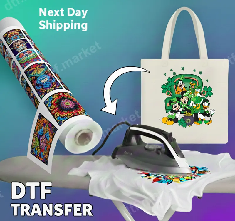 See allBring a touch of Disney magic and Irish luck to your St. Patrick's Day celebrations with this adorable Mickey & Friends DTF transfer. Featuring Mickey Mouse, Minnie Mouse, Goofy, Donald Duck, and Daisy Duck all decked out in festive green outfits, surrounded by shamrocks and a pot of gold, this design is perfect for spreading cheer. This high-quality, ready to press transfer makes customizing your apparel incredibly easy and fun. This delightful design is ideal for Disney enthusiasts, families, and anyone looking to add a whimsical touch to their St. Patrick's Day attire. Whether you're attending a parade, hosting a party, or simply want to show off your holiday spirit, this heat transfer is a fantastic choice. It also makes a wonderful gift for friends and family who love Disney and St. Paddy's Day festivities, allowing them to create personalized apparel or accessories. Applying this heat press transfer is straightforward. Simply use a heat press at 300-325°F for 15 seconds with medium pressure, or apply with a household iron. This iron on transfer works beautifully on a wide variety of fabrics, including cotton, polyester, and blends, ensuring versatility for your crafting projects. There's no need for tedious weeding, making your customization process quick and hassle-free. Our DTF transfers are crafted with professional-grade film and strong adhesive, guaranteeing vibrant colors and exceptional durability. The resulting design is crack-resistant, washable, and incredibly soft to the touch, providing a comfortable and long-lasting finish. Enjoy professional-quality custom apparel with the convenience of a simple, ready to press design.
