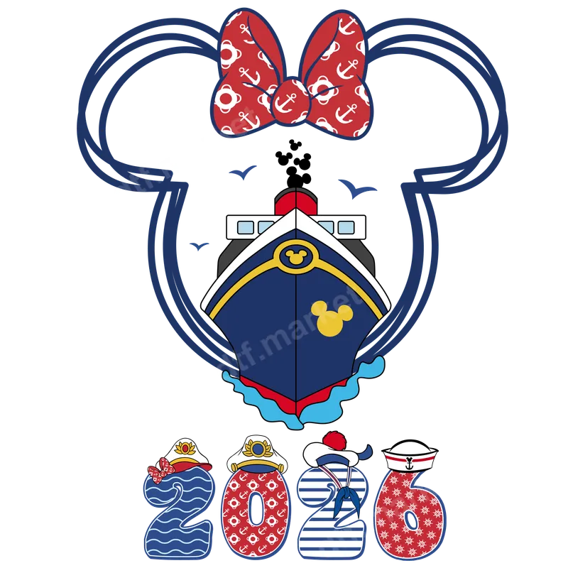 See allSet sail in style with our exclusive Mickey Minnie Cruise 2026 DTF transfer! This vibrant design features the iconic Mickey ear outline with a charming Minnie Mouse bow adorned in anchors and lifebuoys. Centered within is a classic cruise ship, complete with a Mickey silhouette, while the year "2026" is creatively styled with nautical patterns and captain/sailor hats on each digit. This ready to press design captures the magic of Disney and the excitement of a cruise, making it an ideal choice for your upcoming adventure. This delightful heat transfer is perfect for Disney enthusiasts, families planning a magical cruise in 2026, or groups celebrating a special trip together. Imagine matching t-shirts for everyone in your travel party, creating unforgettable memories! It also makes a fantastic gift for loved ones who are anticipating a dream vacation or as a surprise reveal for a future cruise. Applying this iron on transfer is a breeze on cotton, polyester, and blend fabrics. Simply use a heat press at 300-325°F for 15 seconds with medium pressure, then perform a cold peel. For household iron users, ensure even, firm pressure. There's no need for tedious weeding, saving you time and effort while achieving professional results right at home. Crafted using high-quality DTF film and inks, this apparel transfer promises exceptional durability and a soft, smooth feel. The colors are incredibly vibrant, crack-resistant, and designed to withstand countless washes, ensuring your personalized garments look great for years to come. Make your 2026 cruise extra special with this unique and easy-to-apply heat press design.