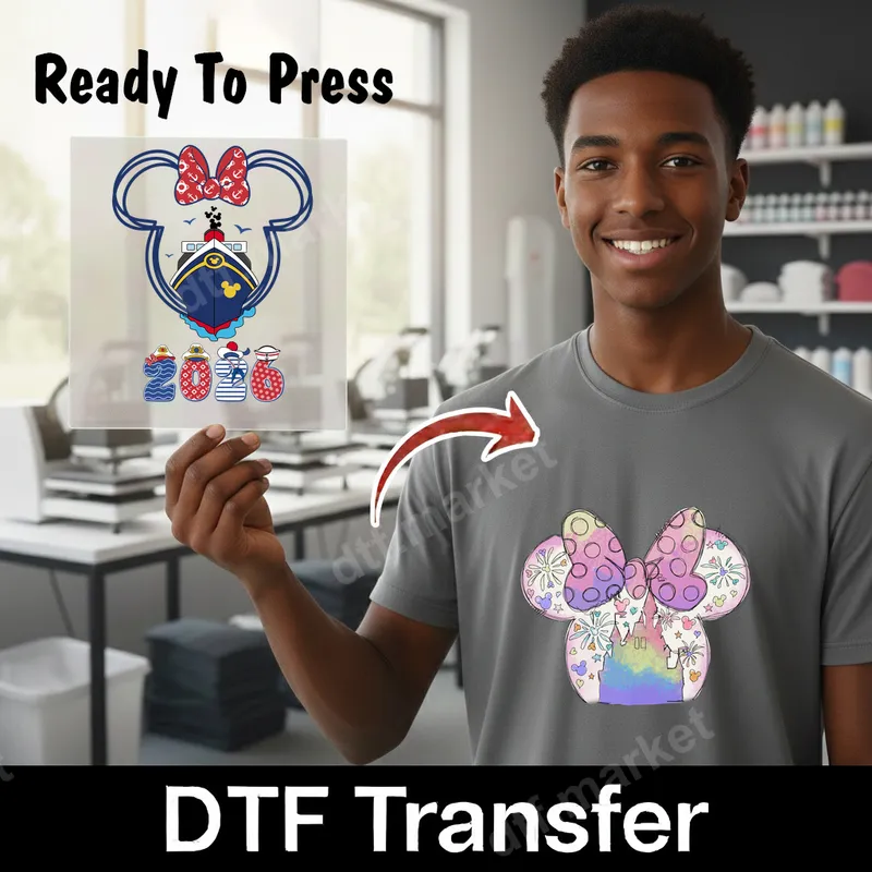 See allThe design features an iconic mouse ear outline with a festive red polka-dot bow, framing a classic cruise ship complete with anchors and seagulls, sailing towards adventure. Below, the year "2026" is creatively styled with nautical elements like life preservers and a captain's hat, capturing the excitement of an upcoming voyage. This vibrant and detailed DTF transfer is an ideal ready to press design for anyone celebrating a special cruise trip. This unique cruise-themed iron on transfer is perfect for families, couples, and friends planning a memorable Disney-inspired vacation in 2026. Create custom t-shirts for cruise excursions, family reunion trips, or simply to commemorate a dream trip. It also makes a fantastic gift for fellow cruisers or as a special souvenir to wear before, during, or after your journey. Applying this heat press transfer is simple and efficient. It works flawlessly on a wide variety of fabrics, including cotton, polyester, and their blends, making it versatile for any apparel. For best results, use a heat press at 300-325°F for 15 seconds with medium pressure. Even if you don't have a heat press, a household iron can achieve great results. No more tedious weeding like vinyl transfer designs, just press and peel! Our direct to film transfer boasts exceptional print quality, delivering vibrant colors that pop and sharp details that last. Engineered to be crack-resistant and incredibly soft to the touch, this apparel transfer ensures comfort and durability wear after wear. Printed on professional-grade DTF film with a strong, reliable adhesive, your custom shirt will look professionally made, standing up to washes without fading or peeling.