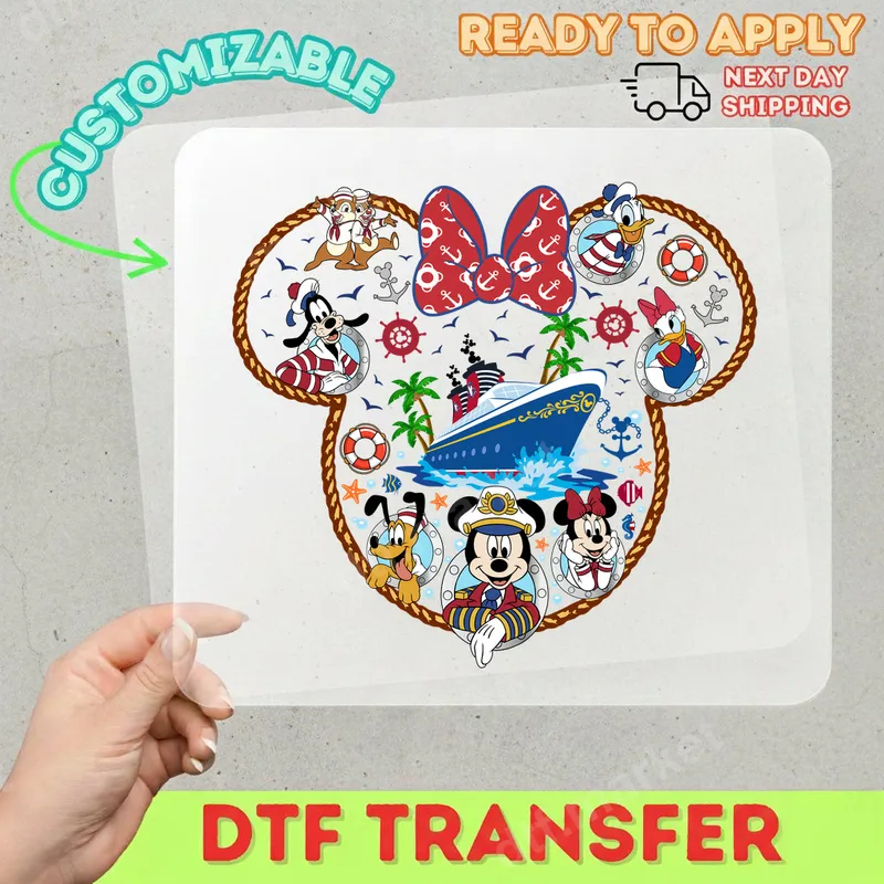 See allEmbark on a magical journey with this delightful Disney Cruise DTF transfer, featuring beloved characters Mickey, Minnie, Donald, Daisy, Goofy, Pluto, Chip, and Dale. The design beautifully captures the spirit of a nautical adventure, with the iconic Mickey Mouse head silhouette crafted from a rope, encompassing a grand cruise ship, palm trees, anchors, and life preservers. This high-quality, ready to press DTF transfer brings a festive, vacation-ready vibe to any garment. This enchanting design is perfect for Disney enthusiasts, families planning a magical cruise vacation, or anyone who loves the timeless charm of Mickey and friends. It makes an excellent gift for fellow Disney lovers, a memorable souvenir for a family trip, or a special way to commemorate a cruise. Create matching family shirts for your upcoming adventure, or design custom apparel for themed parties and events. Our premium direct to film transfer is incredibly easy to apply, working seamlessly with a heat press at 300-325°F for 15 seconds with medium pressure, or even a household iron for smaller applications. Unlike traditional vinyl transfer designs, there's no weeding required, saving you time and effort. It adheres beautifully to a wide range of materials including cotton, polyester, and various blends, ensuring versatility for your crafting projects. Experience professional-grade results with this durable heat transfer. Our DTF transfers boast vibrant colors, a soft hand feel, and excellent crack resistance, ensuring your designs look fantastic and last wash after wash. Transform ordinary apparel into extraordinary keepsakes with this easy-to-use and long-lasting t-shirt transfer, perfect for creating custom shirts, tote bags, and more.