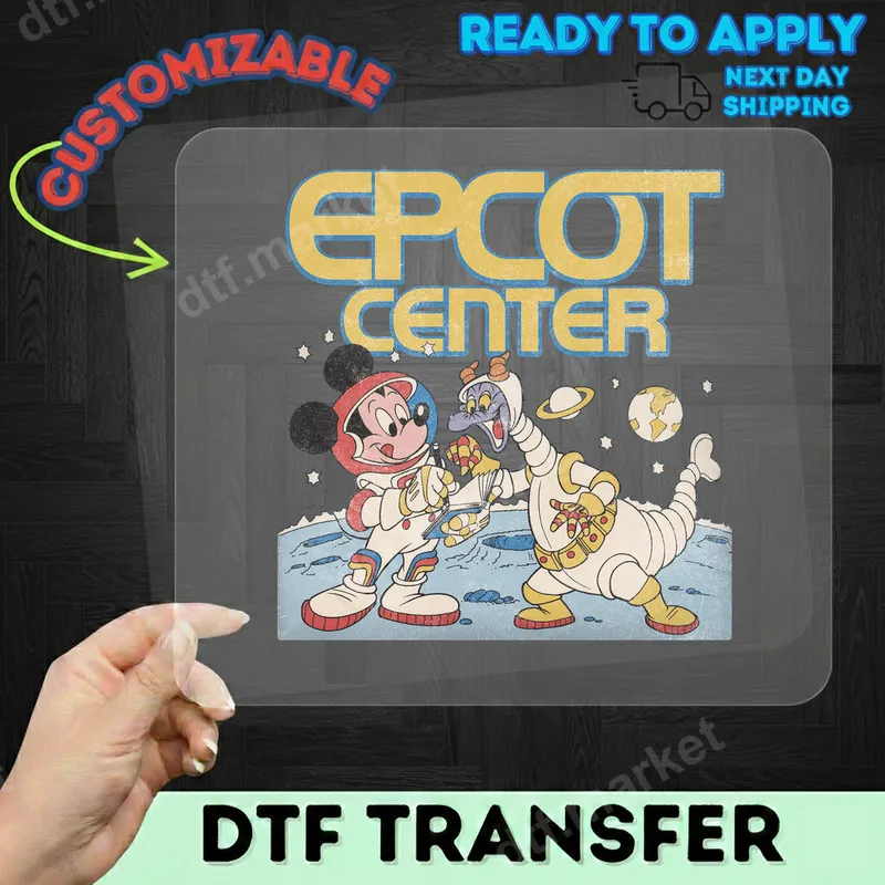 See allDive into nostalgia with this vibrant Epcot Center Mickey and Figment astronaut DTF transfer. This charming retro design depicts Mickey Mouse and Figment in space suits, exploring a moon-like landscape under the iconic "EPCOT CENTER" logo. This ready to press transfer captures the whimsical spirit of classic Disney, perfect for adding a touch of vintage magic to your apparel. The distressed texture gives it an authentic, aged feel that true fans will appreciate. This unique iron on transfer is ideal for Disney fans, Epcot Center enthusiasts, and anyone who cherishes the golden age of theme parks. Create custom t-shirts for family trips to Disney World, personalize hoodies for a vintage-inspired look, or craft unique gifts for birthdays and special occasions. It’s also a fantastic choice for collectors of retro pop culture merchandise, perfect for showing love for classic Disney characters. Applying this high-quality heat press design is simple and hassle-free. Our heat press ready transfers work beautifully on a wide range of fabrics, including cotton, polyester, and cotton-poly blends. For best results, use a heat press at 300-325°F for 15 seconds with medium, even pressure. Unlike traditional vinyl transfer, there's no weeding required – simply press and peel for a perfect finish every time. A household iron can also be used with care for smaller projects. Experience the superior quality of our direct to film transfer technology. Our heat transfer designs boast vibrant colors, exceptional durability, and a crack-resistant finish that stands up to countless washes. The soft-touch feel ensures maximum comfort, seamlessly integrating with your garment. Printed on professional DTF film with strong adhesive, these apparel transfers are designed for longevity, providing a professional-grade look for all your custom creations.