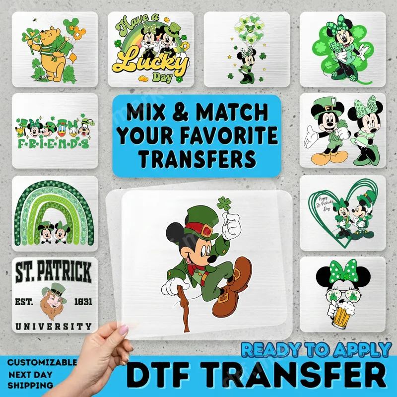 See allThis vibrant DTF transfer features everyone's favorite mouse, Mickey, dressed as a festive leprechaun, ready to celebrate St. Patrick's Day. Adorned in a classic green suit, top hat, and holding a lucky four-leaf clover, Mickey strikes a joyful, dancing pose. This delightful direct to film transfer captures the playful spirit of the holiday, making it a perfect ready to press addition to your celebratory wardrobe or craft projects. Ideal for Disney fans, St. Patrick's Day enthusiasts, and anyone looking to add a touch of Irish charm to their attire, this design is perfect for parades, parties, school events, or casual wear. Create unique gifts for friends and family, or make matching outfits for a festive family gathering. It's also a fantastic way for small businesses to offer exclusive holiday-themed apparel. Applying this high-quality heat transfer is simple, requiring no weeding or intricate setup. It adheres beautifully to a wide range of fabrics including cotton, polyester, and cotton-poly blends. For best results, use a heat press at 300-325°F for 15 seconds with medium pressure, then perform a cool peel. A household iron can also be used, ensuring even pressure across the design. Our premium heat press design is crafted using professional-grade DTF film and boasts exceptional durability. Expect vivid colors that pop, superior stretch and flexibility, and a soft, lightweight feel that won't crack or fade after washing. This iron on decal ensures your custom creations will look professional and last for many celebrations to come.