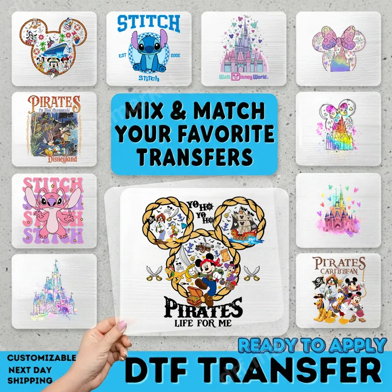 See allEmbark on a swashbuckling adventure with our "Pirates Life for Me" Mickey Mouse DTF transfer. This vibrant design features Mickey, Minnie, Donald, Goofy, and Pluto as pirates, intricately framed within a rope-style Mickey head. Complete with treasure chests, ships, and sabers, this detailed image captures the thrill of a pirate's quest. It's a high-quality, ready to press transfer, perfect for bringing Disney park memories to life on any fabric. This unique heat transfer is ideal for Disney enthusiasts, families planning a trip to Disneyland or Disney World, or anyone who loves the classic Pirates of the Caribbean ride. Create matching t-shirts for family vacations, custom gifts, or unique apparel for pirate-themed parties. It's a fantastic iron on design for celebrating birthdays or simply showing off your love for Disney pirates. Applying this heat press design is incredibly simple, perfect for both beginners and experienced crafters. Our direct to film transfer works beautifully on cotton, polyester, and various fabric blends. For best results, use a heat press at 300-325°F for 15 seconds with medium pressure. Even with a household iron, you can achieve excellent results. No weeding required – just press and peel! Experience superior quality with every apparel transfer from dtf.market. Our DTF transfers are known for exceptional vibrancy, ensuring your design stands out with crisp details and rich colors. They are highly durable, crack-resistant, and offer a soft, lightweight feel. Crafted using professional-grade DTF film and strong adhesive, these transfers provide a long-lasting finish that withstands countless washes.