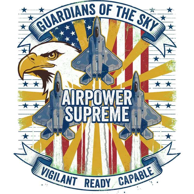 See allThis powerful DTF transfer proudly displays "Guardians of the Sky" with a majestic bald eagle, three modern fighter jets, and a distressed American flag backdrop. Bold text proclaims "Airpower Supreme" and "Vigilant Ready Capable," celebrating the strength and dedication of our air forces. This ready to press design offers a rugged, patriotic aesthetic, perfect for honoring those who serve and protect. Ideal for veterans, active military personnel, military families, or anyone with a deep appreciation for aviation and American patriotism. This heat transfer makes an excellent gift for Father's Day, Veterans Day, Memorial Day, or the 4th of July. Apply this striking design to apparel for parades, patriotic events, or everyday wear to show unwavering support for our armed forces and national defense. Our premium direct to film transfer is designed for effortless application. It works beautifully on a wide range of fabrics including cotton, polyester, and various blends. Achieve professional results using a heat press set between 300-325°F for 15 seconds with medium pressure, or easily apply it with a household iron. Forget the hassle of weeding, as this iron on transfer is completely ready to go, saving you time and effort. Experience exceptional quality with vibrant colors that resist cracking and fading, ensuring your garment looks great wash after wash. The professional-grade DTF film provides a soft, flexible feel that seamlessly integrates into the fabric, not sitting heavily on top. With strong adhesive properties, this durable apparel transfer guarantees a long-lasting, high-quality finish for all your custom creations.
