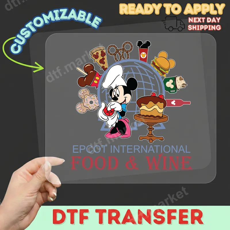 See allThis delightful DTF transfer features Minnie Mouse as a charming chef, surrounded by iconic Epcot International Food & Wine Festival treats like Mickey-shaped pretzels, pizza, burgers, donuts, and decadent cake. The design perfectly captures the festive spirit of exploring global culinary delights. This ready to press design is a must-have for anyone planning a magical trip or wanting to relive cherished memories from the festival. Perfect for Disney enthusiasts, foodies, and Epcot visitors of all ages, this heat press ready design is ideal for creating personalized apparel for family vacations, girls' trips, or fan gatherings. It also makes a fantastic gift for friends and loved ones who adore Disney parks and gastronomic adventures. Show off your love for delicious food, fine wine, and your favorite mouse! Applying your new apparel transfer is simple and efficient. This iron on transfer works flawlessly on a wide variety of fabrics including cotton, polyester, and most blends. For best results, use a heat press at 300-325°F for 15 seconds with medium pressure. It's also suitable for application with a quality household iron. No tedious weeding is required, saving you time and effort. Crafted using premium DTF film and professional-grade inks, this direct to film transfer boasts incredibly vibrant colors and exceptional detail that will truly stand out. Our high-quality heat transfer is crack-resistant, soft to the touch, and designed for long-lasting durability, ensuring your custom creation remains pristine wash after wash. Enjoy a professional finish every time.