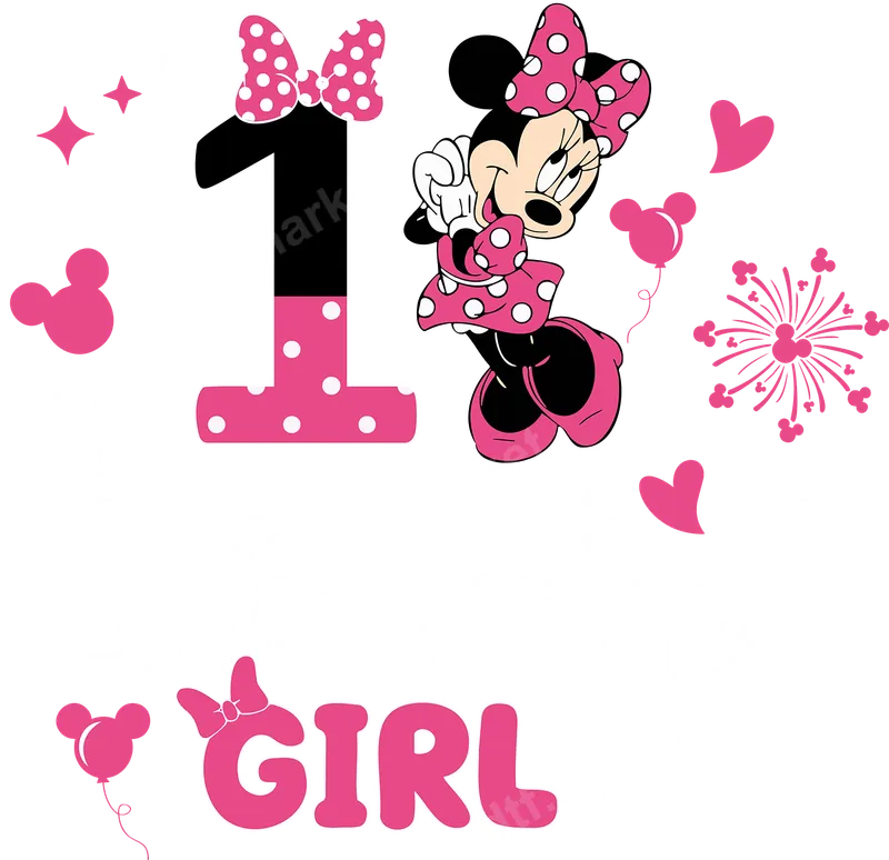 See allThis adorable DTF transfer features a cheerful Minnie Mouse alongside a bold, pink polka-dotted number '1', making it the perfect design for a baby girl's first birthday celebration. The 'Birthday Girl' text, surrounded by cute hearts, stars, and Minnie head balloons, captures a festive and joyful mood. This high-quality, ready to press transfer is ideal for creating a memorable outfit for her special day. Designed for parents, grandparents, and gift-givers, this charming heat press transfer is perfect for milestone birthday parties, baby photoshoots, or as a unique present. Imagine your little one's joy in a custom outfit adorned with this classic character, creating cherished memories for years to come. It’s an excellent choice for anyone looking to personalize apparel for a special occasion. Applying this iron on decal is simple and efficient, requiring no weeding. For best results, use a heat press at 300-325°F for 15 seconds with medium pressure, then perform a cold peel. Alternatively, a household iron can also be used, making it accessible for everyone. It adheres beautifully to cotton, polyester, and various fabric blends, ensuring versatility for different garments. Our professional-grade t-shirt transfer ensures vibrant colors and crisp details that will last through countless washes without cracking or fading. The soft-touch finish provides maximum comfort for delicate skin, while the strong adhesive guarantees a long-lasting application. Elevate any garment with this durable and visually stunning apparel transfer.