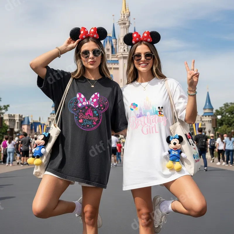 See allCelebrate her special day with our enchanting Minnie Mouse Birthday Girl DTF transfer. This vibrant, ready to press design features a classic Minnie silhouette adorned with a playful pink polka dot bow, a majestic castle, and the cheerful phrase "Birthday Girl" in a beautiful gradient of pink, purple, and blue. It's a premium direct to film transfer that brings a touch of magic to any celebration. This delightful design is perfect for any birthday girl, Disney enthusiast, or family planning a magical theme park adventure. Whether you're heading to the happiest place on earth, hosting a birthday party, or looking for a unique gift, this heat press design is an ideal choice. Create matching shirts for the whole family or make the birthday girl stand out with her personalized apparel. Applying this vibrant design is effortless. This iron on transfer works wonderfully on a wide range of fabrics, including cotton, polyester, and various blends, making it incredibly versatile for any apparel transfer project. You can achieve professional results with a heat press at 300-325°F for 15 seconds with medium pressure, or even use a household iron. Best of all, there's no weeding required, saving you time and effort. Experience the exceptional quality of our DTF transfers. Each shirt design is crafted using professional-grade film and inks, ensuring vibrant colors that pop, superior crack resistance, and a soft, smooth feel against the skin. The strong adhesive guarantees your design will last wash after wash, maintaining its magical appeal for years to come. Make lasting memories with a truly unique and durable transfer.
