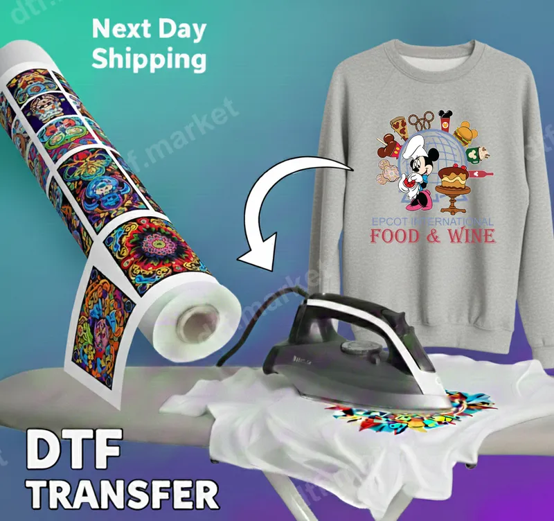 See allIndulge in culinary magic with this charming Minnie Mouse Chef Epcot Food & Wine Festival DTF transfer. This vibrant design features Minnie Mouse proudly sporting a chef's hat, surrounded by international food items and the iconic "EPCOT INTERNATIONAL FOOD & WINE" text. It captures the festive spirit and gastronomic adventure of Disney's beloved event. This premium direct to film transfer is ready to press, making it simple to add Disney magic to your wardrobe. Perfect for Disney enthusiasts, Epcot festival-goers, and food lovers, this heat transfer design is ideal for customizing apparel for your next visit to Walt Disney World. It makes a fantastic souvenir or thoughtful gift for anyone who cherishes the unique blend of culture and cuisine at Epcot. Whether for the parks, a Disney-themed party, or showing off your foodie side, this iron on transfer is a must-have. Applying this high-quality shirt design is a breeze. Our heat press ready transfers work beautifully on cotton, polyester, and their blends. For best results, apply with a heat press at 300-325°F for 15 seconds with medium pressure, then cold peel. A household iron can also be used with firm, even pressure. Enjoy your custom creation in minutes with no weeding required. Experience professional-grade results with our durable and colorful DTF transfer. The inks are incredibly vibrant, ensuring your design pops with rich detail and lasting brilliance. This apparel transfer is designed to be crack-resistant, wash-resistant, and incredibly soft to the touch. Our special DTF film ensures strong adhesion and a smooth finish, making your custom transfer look store-bought.