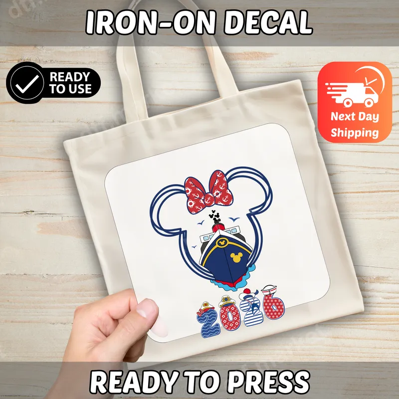 See allSet sail on your next adventure with our exclusive Minnie Mouse Cruise 2023 DTF transfer. This vibrant design features the iconic Minnie silhouette, complete with her signature polka dot bow (adorned with anchors!), framing a charming cruise ship. Below, the year "2023" is artfully rendered with nautical details like sailor hats and stripes, making it the perfect commemorative ready to press transfer for your upcoming family voyage. This high-quality direct to film transfer ensures your garments look professionally customized. Ideal for families planning a Disney-themed cruise or any sea-faring vacation in 2023, this design is perfect for creating matching shirts, hoodies, or beach bags. It’s an excellent choice for cruise farewell gifts, reunion keepsakes, or simply to celebrate a memorable trip. Whether you're traveling with kids, friends, or your extended family, this unique iron on transfer adds a personalized touch to your travel gear. Applying this heat press design is incredibly simple. Our heat press transfers are compatible with cotton, polyester, and most fabric blends, offering versatility for your apparel projects. Achieve professional results in minutes: just press at 300-325°F for 15 seconds with medium pressure. No tedious weeding or layering required, making it a hassle-free solution for stunning custom apparel. For best results, allow it to cool completely before peeling. Experience superior quality with every DTF transfer from dtf.market. Our prints boast vibrant colors, exceptional durability, and a soft-hand feel that won't crack or peel, even after multiple washes. Each t-shirt transfer is produced on professional-grade DTF film with a strong, flexible adhesive, ensuring long-lasting wear and a flawless finish on all your garments and accessories.