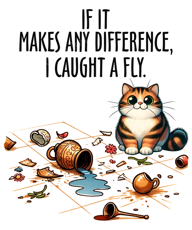 See allThis adorable yet mischievous cat DTF transfer captures the classic feline excuse for a mess. Featuring a cute calico cat sitting innocently amidst broken pottery and spilled liquid, the humorous text reads, "IF IT MAKES ANY DIFFERENCE, I CAUGHT A FLY." This ready to press transfer is perfect for anyone who understands the chaotic charm of living with a cat, bringing a smile to faces wherever it goes. Ideal for cat owners, pet lovers, and anyone with a good sense of humor, this design is a fantastic way to express your personality. It makes a perfect iron on transfer for cat moms, cat dads, or a hilarious custom transfer gift for birthdays, holidays, or just because. Whether you're gifting it or making a fun statement for yourself, this design is sure to be a conversation starter at casual gatherings, coffee runs, or even just lounging at home. Applying this DTF transfer is incredibly simple. Our high-quality heat transfer ensures excellent adhesion to a wide variety of materials, including cotton, polyester, and their blends. For best results, use a heat press at 300-325°F for 15 seconds with medium pressure, then perform a cool peel. It can also be applied with a household iron with care. The best part? There's no weeding required, making your crafting process quick and enjoyable. Experience professional-grade results with this direct to film transfer. Each transfer boasts vibrant colors that pop, superior durability that resists cracking and fading, and a soft-to-the-touch finish once applied. Made with premium DTF film and strong adhesive, your apparel transfer will look fantastic and last through countless washes, maintaining its original charm and quality.