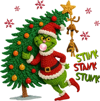 Unleash holiday mischief with this vibrant DTF transfer featuring a whimsical knitted green creature in a Santa suit, playfully blowing a pink bubblegum bubble. This unique design captures the essence of a beloved holiday character, complete with a decorated Christmas tree and dangling dog-like ornaments, all rendered in a delightful knit texture. The playful 'STINK STANK STUNK' text adds an extra touch of humor, making this ready to press transfer a standout for your festive apparel. This humorous design is perfect for anyone who loves funny Christmas apparel, Grinch-like holiday themes, or enjoys a touch of cheeky humor during the festive season. It's an ideal iron on transfer for crafting unique holiday gifts, creating matching family shirts for Christmas morning, or adding inventory to your small t-shirt business. Perfect for Christmas parties, family gatherings, or just spreading some holiday cheer with a grin, this heat transfer design is sure to be a conversation starter. Applying this heat press transfer is a breeze, working flawlessly on various materials including cotton, polyester, and cotton-poly blends. Simply press with a heat press at 300-325°F for 15 seconds with medium pressure, or use a household iron for smaller projects. There’s no weeding required—just peel and press for instant customization. It’s perfect for custom t-shirts, cozy hoodies, festive sweatshirts, tote bags, pillow covers, and even baby onesies, ensuring your garments are ready for the holiday season. For best results and lasting durability, wash inside out and tumble dry low. Experience exceptional quality with this ready to press transfer, showcasing vibrant, full-color printing and intricate knit details that stand out. Our direct to film transfer technology ensures a crack-resistant finish that's soft to the touch, without the heavy feel of traditional vinyl. Each DTF transfer is produced on premium film with a strong adhesive backing, guaranteeing professional-grade results that will impress and endure through many holiday seasons.