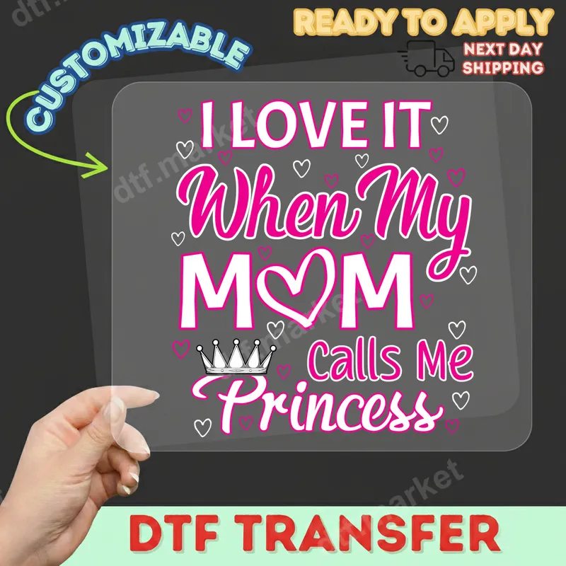 See allCelebrate the special bond with this charming "I LOVE IT When My MOM Calls Me Princess" DTF transfer. Featuring playful pink and crisp white lettering accented with sweet hearts and a little crown, this design captures a heartwarming sentiment perfectly. This ready to press transfer is ideal for adding a personal touch to any garment, bringing a smile to both mom and child. This delightful apparel transfer is perfect for daughters, sons, or anyone who cherishes the special affection from their mother. It makes an excellent gift for Mother's Day, birthdays, Christmas, or simply to show appreciation. Create custom t-shirts, hoodies, or accessories for family gatherings, school events, or everyday wear that proudly displays this loving message. Applying this heat press transfer is a breeze, compatible with cotton, polyester, and various fabric blends. For best results, use a heat press at 300-325°F for 15 seconds with medium pressure. It can also be applied with a household iron with firm, even pressure. Unlike vinyl transfer, there's no tedious weeding required – just press and peel! Our professional-grade DTF transfers deliver exceptional quality, featuring vibrant colors that pop and a soft-to-touch finish. Each heat transfer design is crack-resistant and durable, ensuring your personalized garments withstand countless washes. Enjoy a high-quality, long-lasting custom transfer that feels great and looks amazing.