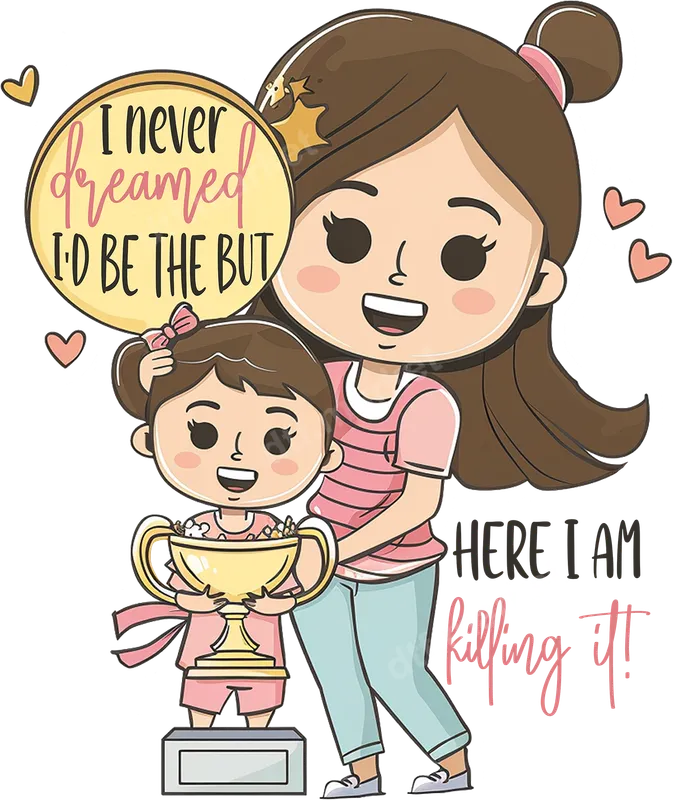 See allThis charming DTF transfer features a proud mom embracing her beaming daughter, who confidently holds a golden trophy. Adorned with the empowering text, 'I never dreamed I'd be the but HERE I AM killing it!', this vibrant design perfectly captures the joy and triumph of motherhood. It's a ready to press transfer celebrating every victory in the parenting journey. This inspirational heat press transfer is ideal for any super mom embracing the challenges and rewards of raising children. It makes a fantastic gift for Mother's Day, birthdays, baby showers, or simply to show appreciation for the 'killing it' mom in your life. Perfect for custom t-shirts or a special hoodie, this iron on transfer adds a personal touch to any garment. Our premium DTF transfer is incredibly versatile, applying to cotton, polyester, and blends. For best results, use a heat press at 300-325°F for 15 seconds with medium pressure. It's also suitable for application with a household iron, making personalization easy. Forget tedious weeding; this heat press design is ready to apply straight from the package. Experience superior quality with our durable and vibrant apparel transfer. Printed with eco-friendly inks on professional-grade DTF film, it ensures bright colors, excellent wash durability, and a soft feel. Our transfers are crack-resistant, peel-resistant, and seamlessly integrate into your fabric. The strong adhesive ensures your custom creations last for years to come.