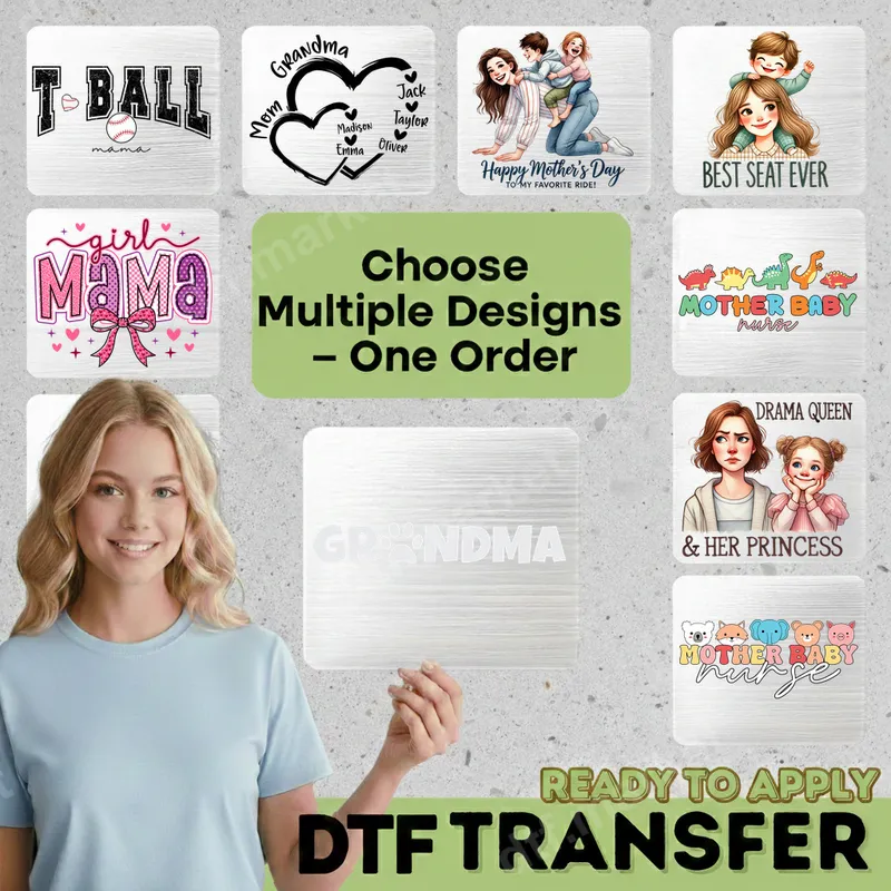 See allThis vibrant collection of DTF transfers celebrates the joys of motherhood, grandparenthood, and the dedicated work of mother-baby nurses. Featuring designs like "T-Ball Mama," "Girl Mama" with a pink bow, charming "Grandma" hearts for personalization, and uplifting "Happy Mother's Day" sentiments, this selection offers something special for every cherished woman. Each ready to press transfer is designed for easy application and stunning visual appeal. Perfect for honoring the special women in your life, these heat transfers are ideal for new mothers, proud grandmas, and compassionate nurses. They make thoughtful gifts for Mother's Day, birthdays, baby showers, or as a heartfelt thank you. Create custom apparel for family gatherings, casual outings, or to proudly display professional pride in the medical field. Applying these premium heat press designs is simple. Our versatile direct to film transfers adhere beautifully to a wide range of fabrics including cotton, polyester, and blends. Use a heat press at 300-325°F for 15 seconds with medium pressure, or apply easily with a household iron. Say goodbye to tedious weeding – these iron on transfers are ready to apply right out of the package. Experience exceptional quality with our professional-grade DTF transfers. Each shirt design boasts vibrant, true-to-color prints that are crack-resistant and soft to the touch, ensuring your creations last. With strong adhesive properties, these heat press ready designs provide a durable and flexible finish, making them perfect for long-lasting apparel transfers on any garment.