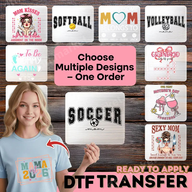 See allThis vibrant collection of Mom Life DTF transfers celebrates motherhood in all its forms, offering designs that range from witty and sassy to sweetly sentimental. Whether you're a proud sports mom cheering from the sidelines, an expectant mother eagerly awaiting a new arrival, or a grandma celebrating her "Grandpod," these ready to press designs capture the joy and humor of family life. Each detailed graphic is perfect for personalizing apparel, ensuring you can express your unique mom style with ease. Our Mom Life DTF designs are ideal for gifting on Mother's Day, birthdays, or as a thoughtful pregnancy announcement. Target audiences include new moms, seasoned mothers, proud grandmothers, and sports team moms. These versatile heat transfer designs make perfect gifts for friends, family, or even for yourself to showcase your mom pride at games, school events, or family gatherings. With options like "Mom Kisses" and "Softball Mom," there's a design for every personality and occasion. Applying these high-quality iron on transfers is simple and efficient. Each DTF transfer adheres beautifully to a wide variety of fabrics, including cotton, polyester, and cotton/poly blends, making them perfect for almost any garment. For best results, apply with a heat press at 300-325°F for 15 seconds with medium pressure, then cold peel. No need for tedious weeding, saving you time and effort compared to traditional vinyl transfer methods. Crafted with professional-grade DTF film, our designs offer exceptional durability and a soft-to-touch feel that integrates seamlessly with your fabric. Enjoy vivid colors that resist cracking, peeling, and fading, ensuring your personalized garments look fantastic wash after wash. These heat press ready designs provide a professional finish for all your custom apparel projects, delivering stunning results that last.