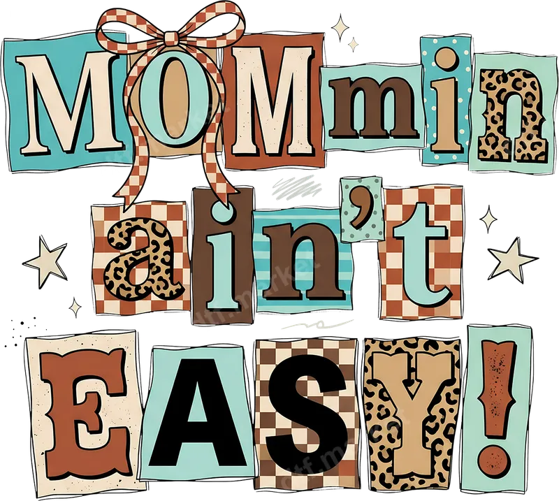 See allEmbrace the hilarious reality of motherhood with our 'MOMmin' Ain't Easy!' DTF transfer. This vibrant design features a playful mix of retro-inspired patterns, including leopard print, checkerboard, stripes, and polka dots, all arranged in a charming scrapbook-style typography. Adorned with a cute plaid bow and whimsical stars, this direct to film transfer captures the chaotic beauty of mom life. It's a high-quality, ready to press heat transfer that adds personality to any garment. This unique apparel transfer is ideal for any mom, mama, or mother figure who tackles the daily grind with a smile and a sense of humor. It makes an excellent gift for Mother's Day, birthdays, baby showers, or just because, celebrating the unsung heroes of parenting. Perfect for group mom shirts, family vacations, or simply adding a touch of relatable fun to your everyday wardrobe. Show off your mom pride with this eye-catching heat press design. Our premium DTF heat transfer is incredibly versatile, adhering beautifully to a wide range of materials including cotton, polyester, and various fabric blends. Applying your new design is simple: use a heat press at 300-325°F for 15 seconds with medium pressure, or easily apply it with a household iron following our instructions. Enjoy a seamless application process with no tedious weeding required, unlike traditional vinyl transfers, making your DIY projects quicker and easier. Experience professional-grade results with every iron on transfer from dtf.market. Our transfers boast exceptionally vibrant colors and crisp details that resist cracking and fading, ensuring your design looks fantastic wash after wash. The finished product offers a soft, lightweight feel, integrating smoothly into the fabric for maximum comfort. Each ready to press transfer is printed on durable, high-quality film with a strong, long-lasting adhesive, guaranteeing a flawless finish for all your custom creations.