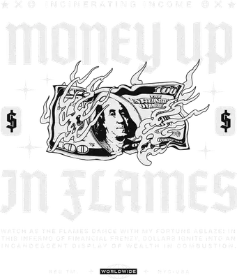 Unleash your inner hustler with this Money Up In Flames DTF transfer, a bold statement piece featuring a highly detailed $100 bill, complete with Benjamin Franklin's portrait, engulfed in dynamic, stylized flames. The distressed gothic lettering 'MONEY UP' and 'IN FLAMES' perfectly frames this powerful image, conveying an edgy, ambitious, and perhaps rebellious vibe. This black and white design is a striking ready to press graphic, perfect for anyone looking to make a visual impact. This unique iron on transfer is perfect for streetwear enthusiasts, hip-hop culture fans, aspiring entrepreneurs, or anyone who appreciates a strong financial statement piece. It makes an excellent gift for birthdays, personal milestones, or for small custom apparel businesses looking to offer distinctive heat transfer designs. Elevate your wardrobe or create merchandise that truly stands out with this captivating burning money graphic. Applying this heat press transfer is incredibly easy. It adheres flawlessly to a wide range of fabrics including cotton, polyester, cotton-poly blends, and even nylon. For best results, use a heat press at 300-325°F for 15 seconds with medium pressure, or apply with a household iron. There's no tedious weeding required—simply peel and press! It's perfect for custom t-shirts, hoodies, sweatshirts, tote bags, pillow covers, and denim jackets. For lasting durability, wash garments inside out and tumble dry low. Experience superior quality with this ready to press transfer. It boasts vibrant, full-color (though monochrome here, the quality applies to print details) printing with exceptional fine detail and a slightly distressed texture that enhances its street-wise aesthetic. Crack-resistant and soft to the touch, it offers a professional finish without the heavy feel of traditional vinyl. Each direct to film transfer is produced on premium DTF film with a strong adhesive backing, ensuring professional-grade results every time you press.