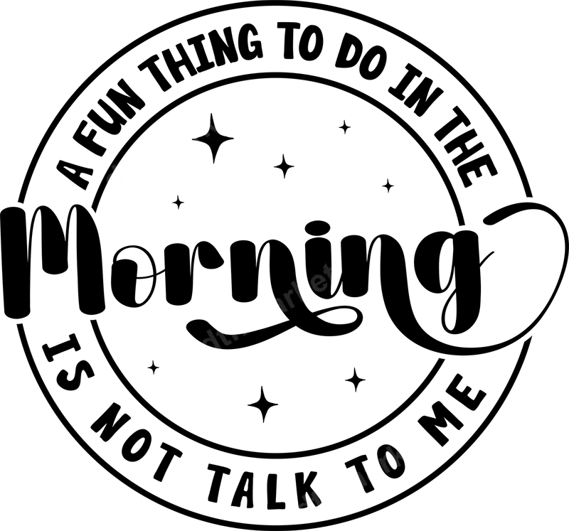 See allEmbrace your inner non-morning person with this hilarious DTF transfer featuring the relatable phrase, 'A Fun Thing To Do In The Morning Is Not Talk To Me.' This bold, circular design combines playful script and classic block fonts, accented with sparkling stars, to perfectly capture that pre-coffee mood. It’s a witty statement piece, delivered as a high-quality, ready to press design, ensuring vibrant results on your chosen apparel. This unique heat press transfer is ideal for anyone who appreciates a good dose of morning sarcasm. Perfect for introverts, caffeine enthusiasts, or those who simply aren't at their best before noon, it makes a fantastic gift for friends, family, or coworkers who share the sentiment. Create custom t-shirts for weekend lounging, hoodies for quiet mornings, or even tote bags for those essential coffee runs. Applying this apparel transfer is simple and requires no tedious weeding! Designed for easy application, this iron on transfer works flawlessly with a heat press at 300-325°F for 15 seconds with medium pressure, then a cold peel. You can even use a household iron for smaller applications by ensuring even, firm pressure. It adheres beautifully to a wide range of fabrics, including cotton, polyester, and various blends, making it a versatile shirt design solution. Experience professional-grade results with this premium quality direct to film transfer. Our DTF transfers are known for their vibrant colors, exceptional durability, and soft-to-the-touch feel. The advanced film and strong adhesive ensure your design is crack-resistant, long-lasting, and washes well, maintaining its integrity even after numerous cycles. Get a durable and eye-catching custom transfer that stands out.