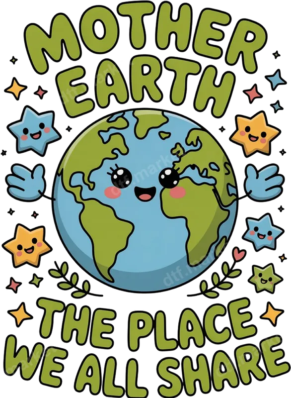 See allThis charming DTF transfer features a delightful cartoon Mother Earth, complete with a joyful expression and waving hands, surrounded by smiling stars and greenery. The design proudly displays the heartwarming message "MOTHER EARTH THE PLACE WE ALL SHARE" in a friendly, bubbly green font. This ready to press design is perfect for anyone looking to celebrate our planet with a touch of cuteness and positivity, making it an ideal heat press transfer for personalized apparel. This design is ideal for environmental advocates, teachers, students, and families who want to express their love for the Earth and promote unity. It’s perfect for Earth Day events, school projects, community clean-ups, or simply as a thoughtful gift for eco-conscious friends. Create unique matching shirts for group activities or add a touch of global awareness to everyday wear. Applying this vibrant DTF transfer is incredibly simple and requires no weeding. It works beautifully on a wide range of materials, including cotton, polyester, and various fabric blends. For best results, use a heat press at 300-325°F for 15 seconds with medium pressure, then peel cold. If you don't have a heat press, a household iron can also be used, making it an accessible iron on transfer for everyone. Crafted with professional-grade DTF film, this heat press design ensures stunningly vibrant colors and a soft, smooth finish that feels great to the touch. The durable adhesive guarantees a long-lasting print that resists cracking, fading, and peeling, maintaining its quality wash after wash. Transform your garments into impactful statements with this high-quality t-shirt transfer, designed to endure and inspire.