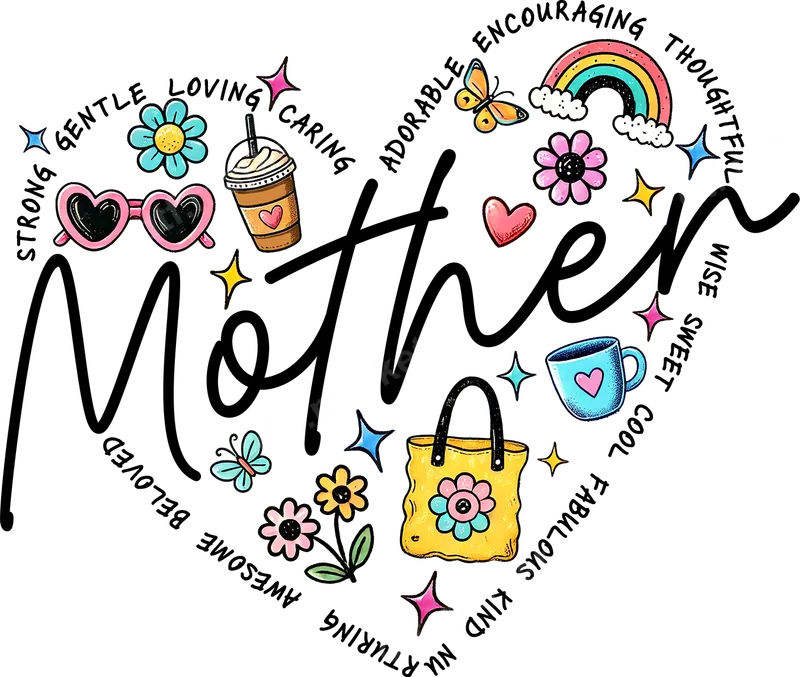 See allThis vibrant DTF transfer features the word "Mother" beautifully designed within a heart shape, surrounded by a delightful collection of positive attributes like "Strong," "Loving," "Caring," "Fabulous," and "Kind." Adorable doodles of heart-shaped sunglasses, an iced coffee, a rainbow, flowers, butterflies, a coffee mug, and a stylish tote bag add a charming, whimsical touch. This ready to press design celebrates the essence of motherhood with a sweet and appreciative vibe, perfect for creating unique apparel. This heartwarming apparel transfer is designed for anyone wanting to celebrate or honor a mother, grandmother, stepmom, or maternal figure. It's an ideal choice for Mother's Day gifts, birthday presents, or just to show appreciation on any ordinary day. Perfect for crafting personalized gifts for new moms, seasoned mothers, or as a thoughtful gesture from children, partners, or friends, making any garment special and meaningful. Applying this direct to film transfer is straightforward and hassle-free. Our high-quality heat press transfer works beautifully on a wide range of fabrics, including cotton, polyester, and their blends. For best results, use a heat press at 300-325°F for 15 seconds with medium pressure. It can also be applied with a household iron. Enjoy the convenience of a ready to press design that requires no weeding, saving you time and effort. Experience professional-grade results with our premium heat transfer design. Each iron on transfer boasts incredibly vibrant colors and sharp details that stand out. Engineered to be crack-resistant and soft to the touch, this design will last wash after wash without fading or peeling. Made with durable DTF film and strong adhesive, you're getting a superior quality shirt design that's built to impress and endure.