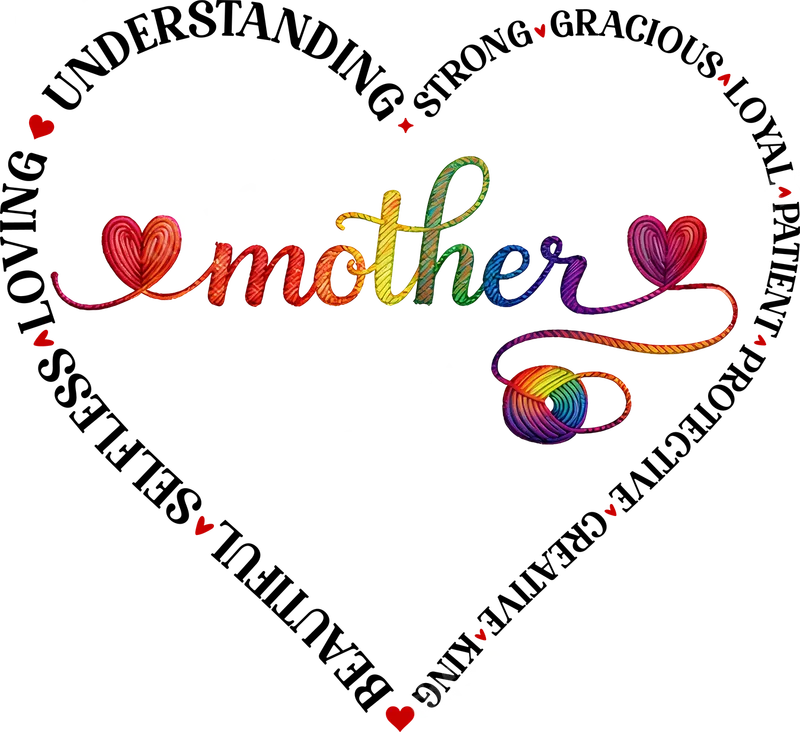 See allThis beautiful DTF transfer design celebrates mothers with a heartfelt tribute. It features the word "mother" in a stunning rainbow-colored, yarn-textured script, creatively flowing into two small hearts and a whimsical yarn ball. Encircling this central motif, various loving attributes like "Understanding," "Strong," "Gracious," and "Patient" form a delicate heart outline. This ready to press transfer captures the warmth and essential qualities of a mother, making it a perfect piece for anyone wanting to honor the special women in their lives. Ideal for expressing gratitude and love, this design is perfect for Mother's Day, birthdays, or just because. It makes a thoughtful gift for moms, grandmothers, stepmoms, or any maternal figure who embodies these wonderful characteristics. Crafters and small business owners can use this versatile heat press design to create custom t-shirts, tote bags, and other apparel for their customers, adding a personalized touch that speaks volumes about appreciation. Our premium DTF transfers are incredibly versatile, pressing beautifully onto a wide range of fabrics including cotton, polyester, and their blends. For best results, apply with a heat press at 300-325°F for 15 seconds with medium pressure, then peel cold. You can also achieve great results with a household iron, following included instructions. Forget tedious weeding; these iron on transfers save you time and effort, making customization a breeze for everyone. Experience professional quality with every application. Our direct to film transfers boast vibrant colors, exceptional durability, and a soft-to-the-touch finish that won't crack or peel. Crafted using high-quality DTF film and strong adhesive, your finished garments will stand up to countless washes while maintaining their pristine look. Elevate your apparel projects with a ready to press transfer that truly shines.