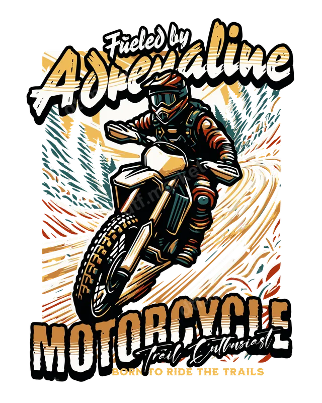 See allThis dynamic DTF transfer features a high-energy motocross rider tearing through a scenic trail, capturing the thrill of off-road adventure. Bold text declares 'Fueled by Adrenaline' and 'MOTORCYCLE Trail Enthusiast,' making it a powerful statement for any dirt bike lover. This vivid design is a ready to press transfer, perfect for adding an instant boost of extreme sports style to your apparel. Its detailed artwork offers a professional quality heat transfer. Ideal for motocross enthusiasts, dirt bike racers, and anyone who lives for the adrenaline rush of two-wheeled adventure. This design makes an excellent gift for birthdays, Father's Day, or just because, for friends and family who love motorsports and outdoor recreation. It's perfect for customizing apparel for riding clubs, event merchandise, or simply creating a personalized shirt design. Applying this transfer is simple and efficient, suitable for fabrics like cotton, polyester, and blends. For best results, use a heat press at 300-325°F for 15 seconds with medium pressure. It can also be applied with a household iron, though results may vary. Enjoy the convenience of a no-weeding iron on transfer, allowing you to quickly create custom garments without the hassle. Crafted with professional-grade DTF film, this transfer ensures exceptional durability and a premium finish. Colors remain vibrant and resist cracking or peeling, even after multiple washes. The strong adhesive creates a soft, flexible feel that seamlessly integrates with the fabric, providing a comfortable and long-lasting apparel transfer. Experience the high-quality difference of our direct to film transfers, designed to endure.