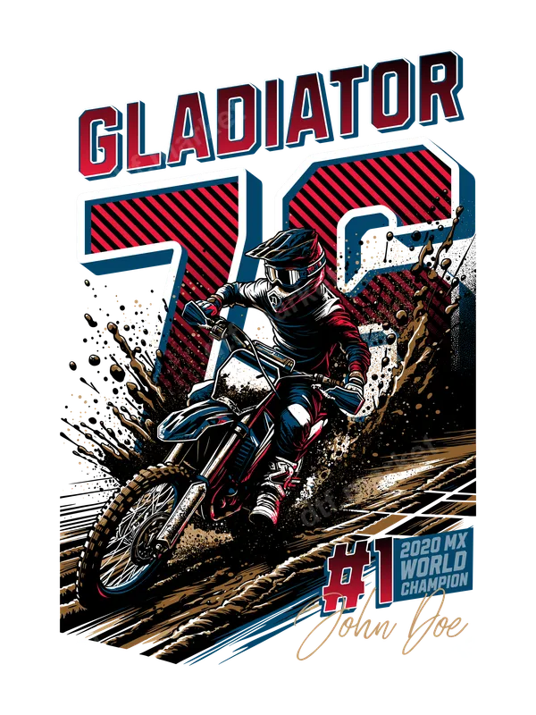 See allUnleash the adrenaline with this dynamic Motocross Gladiator 79 DTF transfer, perfect for anyone who lives for the thrill of the dirt track. This bold design features a fiercely focused motocross rider mid-action, kicking up a dramatic spray of mud, beneath prominent "GLADIATOR" lettering and the number "79". Celebrating a "#1 2020 MX WORLD CHAMPION" vibe, this vibrant and detailed ready to press transfer captures the raw energy of championship racing. This high-octane heat press design is a must-have for motocross riders, dirt bike enthusiasts, and extreme sports fans. It's an ideal apparel transfer for personalizing gear for race day events, gifting to your favorite motorsport dad or son, or simply showcasing your passion for off-road adventure. Create unique birthday gifts, team shirts, or custom merchandise that stands out in the crowd with this distinctive graphic. Applying your new design is effortless. Our premium DTF transfer works flawlessly on a wide range of materials, including cotton, polyester, and various fabric blends. For best results, use a heat press at 300-325°F for 15 seconds with medium pressure, then cold peel. A household iron can also be used with care. Forget tedious weeding; this iron on transfer comes ready to press right out of the package, saving you time and effort. Experience superior quality with our direct to film transfer technology. Each print boasts incredibly vibrant colors and sharp details that pop on any garment. The transfers are designed to be crack-resistant, peel-resistant, and surprisingly soft to the touch, ensuring a professional, long-lasting finish. Crafted on durable DTF film with a strong adhesive, your custom t-shirt transfer will endure countless washes and adventures.