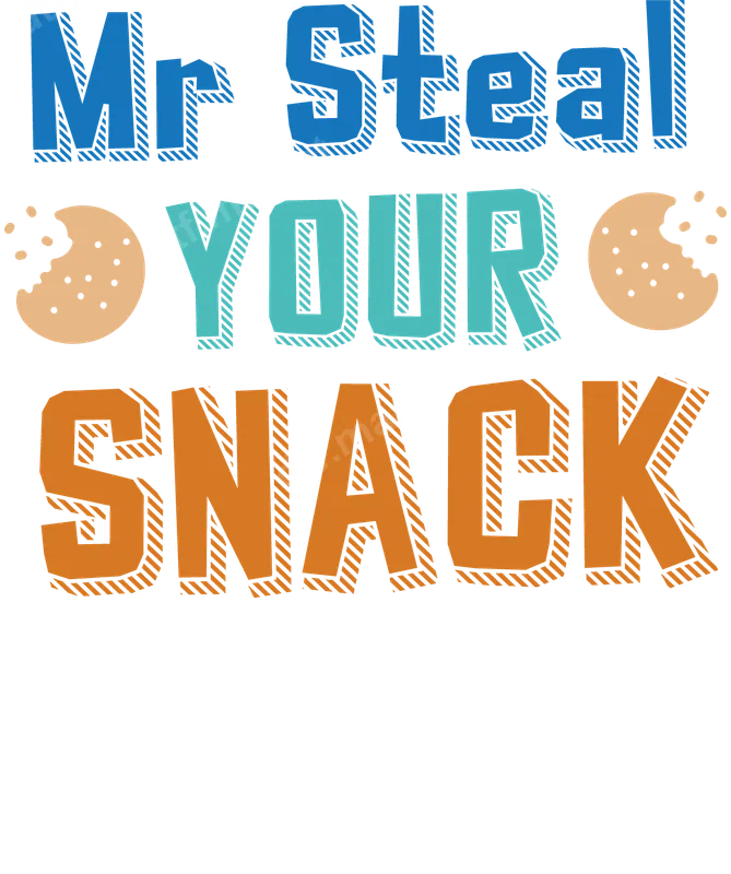 See allThis playful 'Mr Steal Your Snack' DTF transfer features bold, colorful lettering in blue, teal, and orange, with a fun striped 3D shadow effect. Two half-eaten chocolate chip cookies flank the text, adding humor and personality. This vibrant design is a perfect ready to press transfer for anyone with a mischievous side or a serious love for snacks, ensuring your custom apparel stands out. Ideal for parents with hungry kids, pet owners whose furry friends eye every treat, or anyone known for raiding the snack pantry. This versatile heat press design makes a fantastic gift for birthdays, family gatherings, or casual wear. It's also great for small businesses seeking unique, funny t-shirt transfers. Our premium DTF transfer works beautifully on 100% cotton, polyester, and various blends, making it a versatile apparel transfer. For best results, use a heat press at 300-325°F for 15 seconds with medium pressure. It can also be applied with a household iron. Enjoy the convenience of a ready to press design – no complex weeding or layering needed, just press and peel! Experience professional-grade quality with every iron on transfer. Our direct to film transfers boast vibrant, crack-resistant colors and a soft-touch finish for maximum comfort. Crafted using high-quality DTF film and strong adhesive, this heat transfer guarantees a durable, long-lasting application that will look fantastic for years to come.