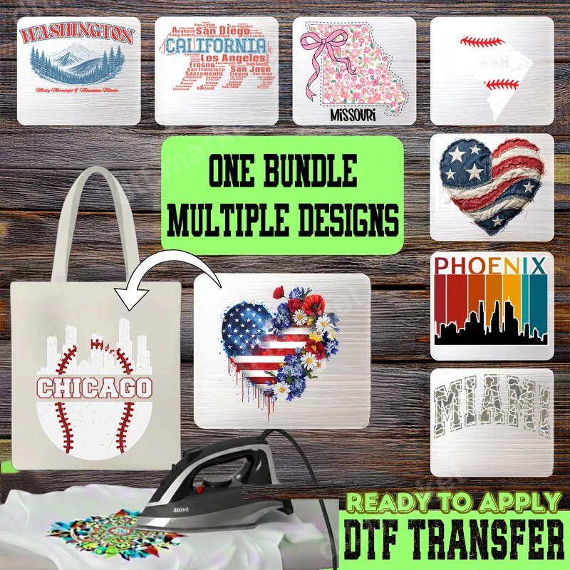 See allDiscover our versatile Multi-Design DTF Transfer Bundle, packed with an array of vibrant, ready to press designs celebrating regional pride and American spirit. This unique collection features distinct styles, including the rustic Washington mountains, a dynamic California city word cloud, a charming floral Missouri state, a classic Chicago baseball skyline, and iconic Phoenix and Miami cityscapes. Each DTF transfer in this bundle is crafted to provide a professional, high-quality finish, making it effortless to personalize your apparel. This comprehensive bundle is ideal for small business owners, crafters, and individuals looking to create custom apparel with a personal touch. Perfect for celebrating local heritage, state pride events, national holidays like the 4th of July, or simply showing off your favorite city. They make fantastic gifts for residents, travelers, or anyone with a deep connection to these iconic American locations. Whether for family reunions, travel souvenirs, or everyday wear, these designs offer something for everyone. Applying these iron on transfers is incredibly simple, suitable for a wide range of fabric types including cotton, polyester, and cotton/poly blends. For best results, use a heat press at 300-325°F for 15 seconds with medium pressure, then peel cold. You can also achieve great results with a household iron, making them accessible for all skill levels. Unlike traditional vinyl transfer designs, our DTF transfers require no weeding, saving you time and effort. Our premium DTF transfers boast exceptional print quality, ensuring vibrant colors and crisp details that truly stand out. Engineered to be durable and crack-resistant, these designs maintain their integrity wash after wash. The professional-grade DTF film provides a soft, flexible feel on your garment, moving with the fabric without stiffness. Experience superior adhesion and longevity with every ready to press transfer from dtf.market, transforming ordinary items into extraordinary pieces.