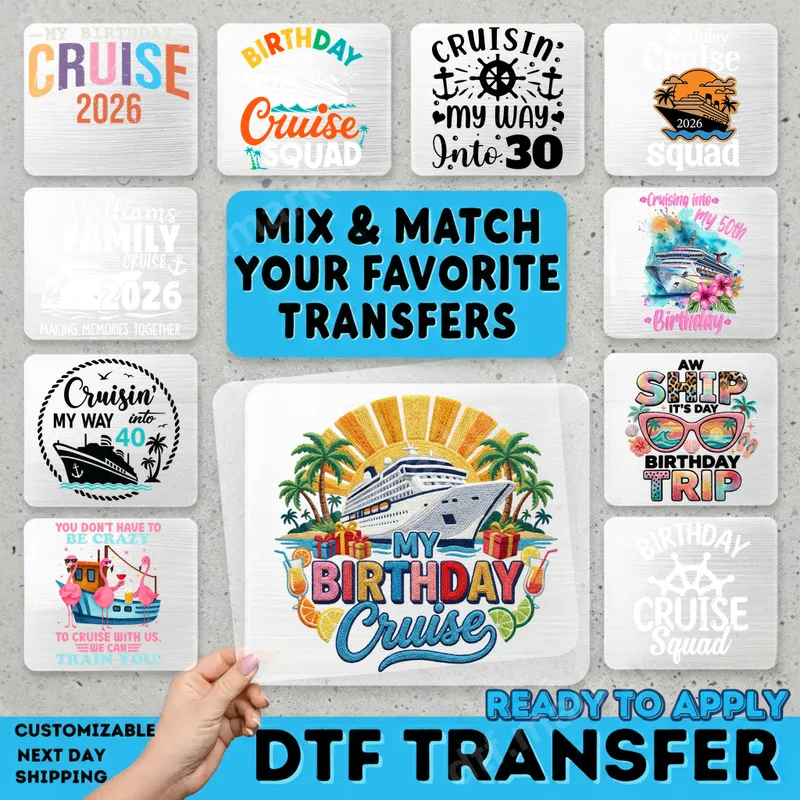 See allThis colorful DTF transfer captures the ultimate birthday celebration at sea with its "My Birthday Cruise" design. Featuring a majestic cruise ship sailing past lush palm trees under a radiant sun, surrounded by festive gifts and tropical cocktails, this design is the perfect ready to press graphic for your special voyage. The vibrant colors and intricate details make it an eye-catching statement piece for any celebratory occasion. Ideal for anyone celebrating a birthday cruise, turning a milestone age on vacation, or organizing a group birthday trip. This versatile heat transfer makes an excellent gift for the birthday person or unique matching apparel for the entire cruise squad. Whether it's for a friend, family member, or yourself, create unforgettable memories with custom t-shirts, tank tops, or tote bags for your birthday adventure. Applying this professional-grade direct to film transfer is effortless. It works beautifully on a wide range of fabrics including cotton, polyester, and their blends, making it perfect for custom apparel. For best results, use a heat press at 300-325°F for 15 seconds with medium pressure. It can also be applied with a household iron (though a heat press is recommended for optimal adhesion). Enjoy a hassle-free process with no weeding required, simply press and peel. Our premium DTF transfers are renowned for their exceptional quality. Expect incredibly vibrant colors that pop, superior crack resistance for long-lasting wear, and a soft-to-touch feel that integrates seamlessly with the fabric. Each heat press design is printed on high-quality DTF film with a strong, durable adhesive, ensuring a professional finish that withstands countless washes. Create stunning, durable garments with ease.