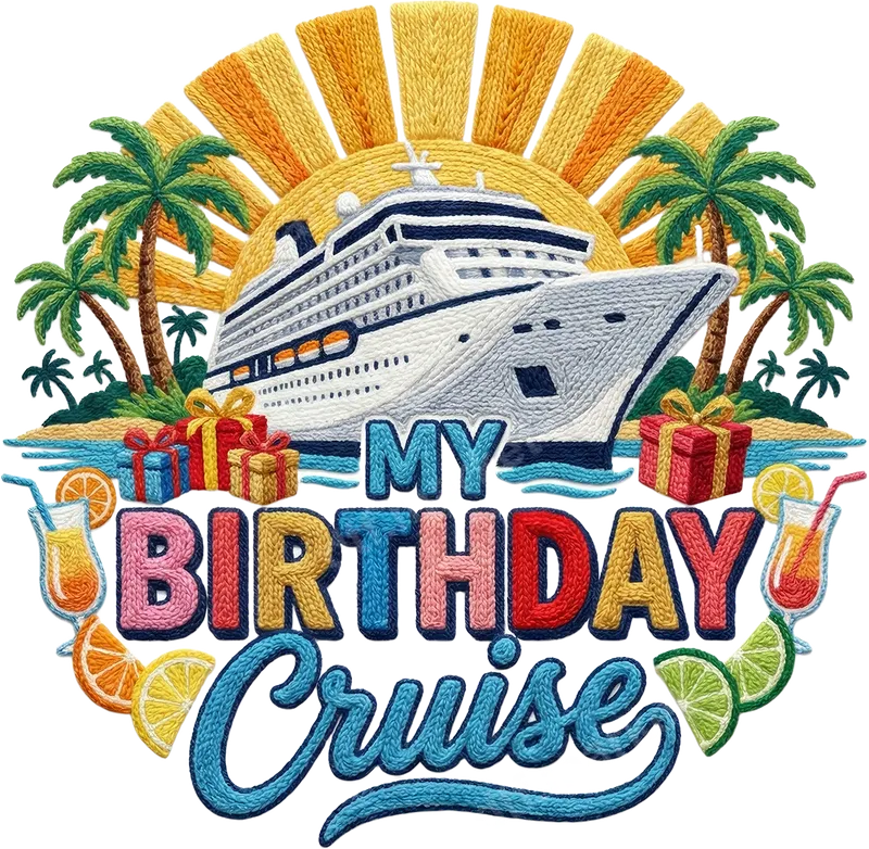 See allThis vibrant DTF transfer captures the joyous spirit of a birthday cruise, featuring a majestic cruise ship sailing past a tropical island with swaying palm trees and festive gift boxes. The design is artfully rendered with a charming, textured look reminiscent of embroidery, making the colorful "MY BIRTHDAY Cruise" lettering pop. This ready to press heat transfer is perfect for celebrating your special voyage or gifting to a fellow traveler. Ideal for birthday celebrants, cruise enthusiasts, and anyone planning a tropical getaway, this heat press design is perfect for group cruise shirts, family vacation apparel, or a memorable souvenir. Whether it's for a birthday party send-off, the cruise itself, or a themed gathering, this iron on transfer brings a festive, personalized touch to any garment. Our premium DTF transfers are incredibly versatile and can be applied effortlessly to a wide range of materials, including cotton, polyester, and various fabric blends. For best results, use a heat press set at 300-325°F for 15 seconds with medium pressure, then peel cold. A household iron can also be used with careful application. Best of all, there's no tedious weeding required, saving you time and effort. Experience professional quality with vibrant, long-lasting colors that resist cracking and fading, ensuring your design looks great wash after wash. The soft-touch finish and strong adhesive of our direct to film transfers ensure durability and comfort. Create custom apparel quickly and easily with this high-quality, professional-grade transfer.