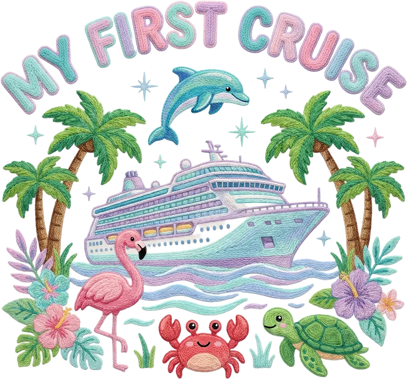 See allCelebrate a special journey with our 'My First Cruise' DTF transfer. This vibrant design captures the excitement of a maiden voyage, featuring a charming cruise ship, playful dolphin, elegant flamingo, and friendly sea turtle, all framed by swaying palm trees and tropical flowers. The pastel colors and unique textured look give this direct to film transfer a delightful, embroidered feel. It's a high-quality, ready to press design perfect for commemorating a memorable milestone. This adorable heat press design is ideal for anyone embarking on their first cruise, especially children and families. Perfect for cruise ship enthusiasts, vacation-goers, or those celebrating a memorable family trip, it makes fantastic custom apparel. Create matching shirts, special gifts for first-time travelers, or unique souvenirs. It’s a wonderful choice for parents documenting their little one's big travel debut. Our premium DTF transfer applies beautifully to cotton, polyester, and blends. For best results, use a heat press at 300-325°F for 15 seconds with medium pressure, then peel cold. A household iron can also be used with instructions. Enjoy the convenience of a ready to press transfer with no weeding required, making custom garment creation simple and fast. Experience exceptional quality with our direct to film transfers. Each iron on transfer boasts vibrant, crack-resistant colors that stay soft to the touch, even after washes. Made with professional-grade DTF film and strong adhesive, you get a premium t-shirt transfer that looks fantastic and lasts. Elevate your apparel with this durable and beautiful heat press ready design.