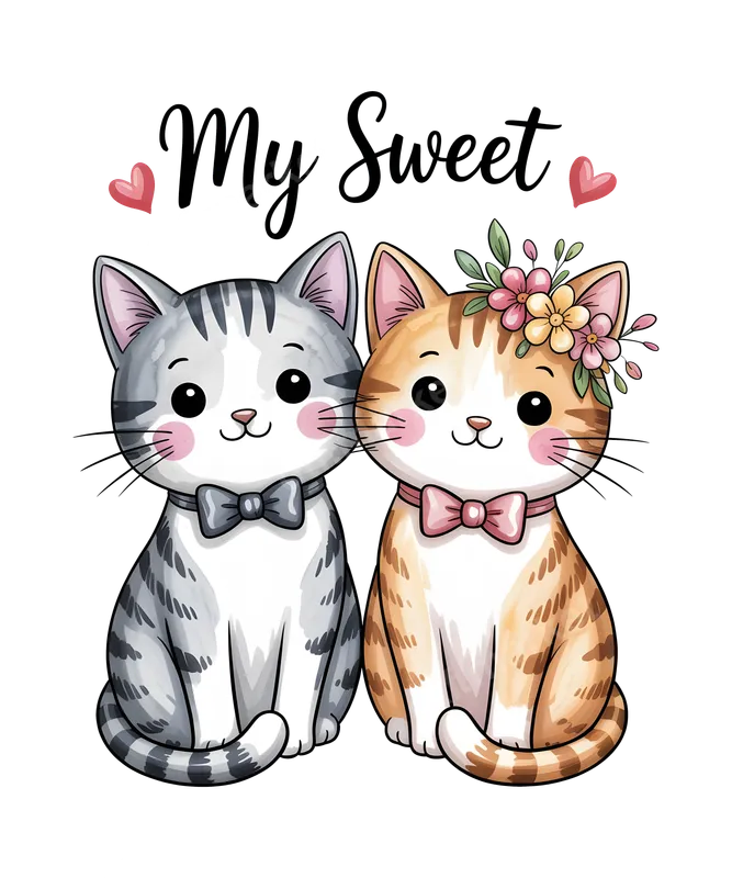 See allThis delightful "My Sweet" cats DTF transfer features two adorable cartoon cats, a grey tabby and an orange tabby adorned with a sweet floral crown, alongside charming pink hearts. It's a perfect DTF transfer for anyone looking to add a touch of cuteness and affection to their apparel. This ready to press transfer brings vibrant, high-quality artwork directly to your chosen fabric. Ideal for cat lovers, couples, or anyone celebrating a special bond, this design makes a heartwarming statement. It's an excellent choice for Valentine's Day gifts, anniversary surprises, or just to show your affection on everyday wear. Perfect for matching outfits, creating unique gifts for friends and family, or adding a personal touch to your wardrobe. Applying this design is incredibly simple. Our premium heat press transfers work beautifully on a wide range of materials, including cotton, polyester, and various blends. For best results, use a heat press at 300-325°F for 15 seconds with medium pressure. It's also suitable for application with a household iron (follow instructions carefully). There's no weeding required, making your crafting process quick and enjoyable. Experience the professional quality of our direct to film transfers. Each apparel transfer boasts vivid colors that pop, superior stretch, and excellent crack resistance, ensuring your design looks fantastic wash after wash. The soft-touch feel and strong adhesive of our professional DTF film guarantee a durable and long-lasting finish on any garment.