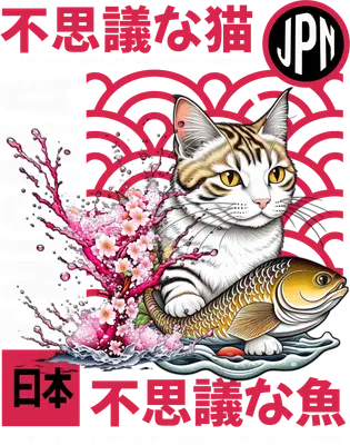 Mysterious Japanese Cat DTF Transfer | Koi Fish & Cherry Blossom Art