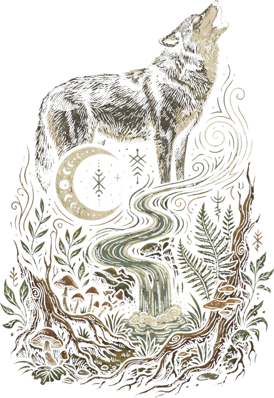 Mystic Howling Wolf Moon Forest Waterfall DTF Transfer Nature Spirit