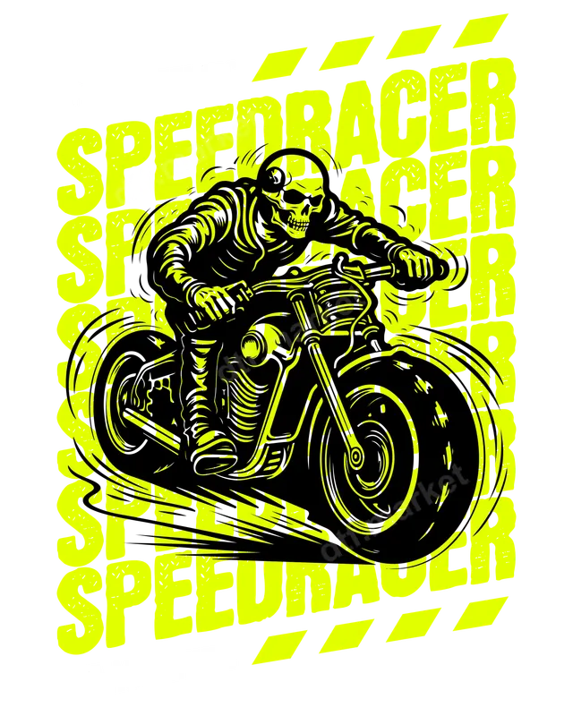 See allDive into the fast lane with our electrifying 'Speedracer Skeleton Biker' DTF transfer. This dynamic design features a fierce skeleton rider tearing it up on a classic motorcycle, surrounded by bold, distressed 'SPEEDRACER' text in vibrant neon yellow. The intense black and neon contrast creates an edgy, high-octane vibe, perfect for anyone who lives life in the fast lane. This ready to press transfer brings maximum attitude to your apparel. This unique apparel transfer is ideal for motorcycle clubs, racing enthusiasts, or anyone who loves the thrill of speed and a rebellious aesthetic. It makes an excellent gift for bikers, gearheads, or friends who appreciate a cool, gothic-inspired design with a modern street edge. Perfect for everyday wear, bike rallies, motorsports events, or just showcasing your passion for two-wheeled adventures. Transform plain garments into statement pieces. Applying this vibrant direct to film transfer is straightforward and hassle-free. Our heat press ready transfers work flawlessly on cotton, polyester, and various fabric blends. For best results, use a heat press at 300-325°F for 15 seconds with medium pressure, then cold peel the film. No need for complicated weeding, layering, or dealing with excess material – just press and go! A household iron can also be used with careful application. Experience superior quality with our professional-grade DTF transfers. This iron on decal offers stunning color vibrancy, exceptional durability, and a remarkably soft touch that integrates seamlessly with your fabric. Our premium DTF film ensures your design is crack-resistant, fade-resistant, and built to withstand countless washes, maintaining its sharp details and vivid neon yellow. The strong adhesive guarantees a long-lasting bond to your chosen garment.