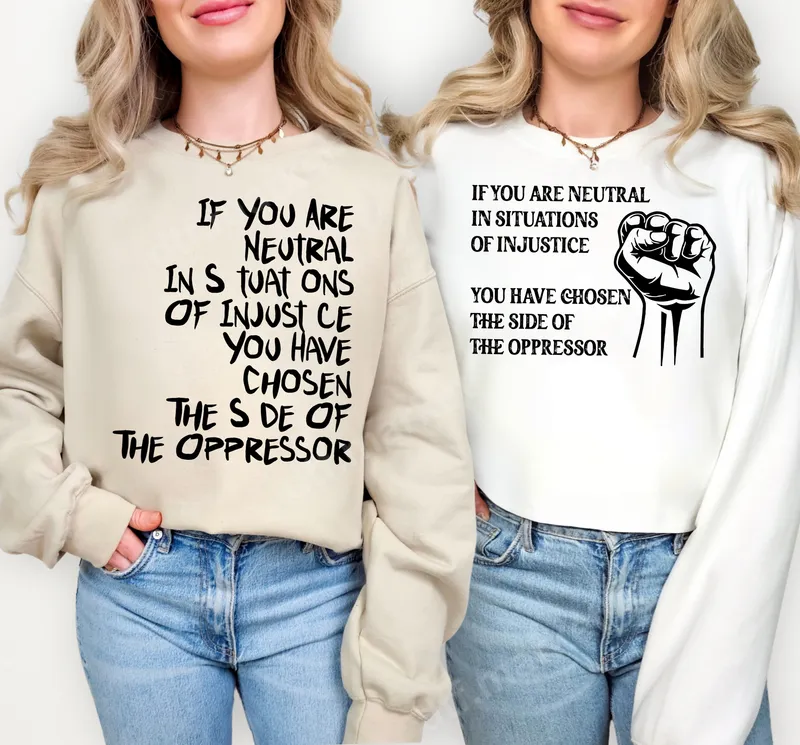 See allUnleash a bold statement with our 'If You Are Neutral Injustice' DTF transfer, featuring a powerful quote and an iconic raised fist symbol. This ready to press design is a stark reminder that silence in the face of wrongdoing is a choice. The distressed, impactful typography combined with the symbol of solidarity makes for a visually striking and thought-provoking apparel transfer that demands attention and encourages reflection. This powerful heat transfer is designed for activists, advocates, and anyone passionate about social justice, human rights, or equality. It's ideal for making a statement at protests, rallies, community events, or simply as everyday wear to express your convictions. It makes a meaningful gift for friends, family, or colleagues who stand firmly against oppression and strive for a more just world. Applying this iron on transfer is incredibly straightforward. It works beautifully on a wide range of fabrics including cotton, polyester, and various blends, making it versatile for any garment. Simply use a heat press at 300-325°F for 15 seconds with medium pressure, then perform a cold peel. For those without a heat press, a household iron can also be used following specific instructions. Best of all, there's no weeding required, saving you time and effort. Our professional-grade DTF transfers deliver exceptional quality, featuring vibrant colors and crisp details that resist cracking and fading even after multiple washes. The strong adhesive ensures a soft-to-touch finish that feels integrated with the fabric, not bulky. Create durable, professional-looking custom apparel that carries your message with pride.