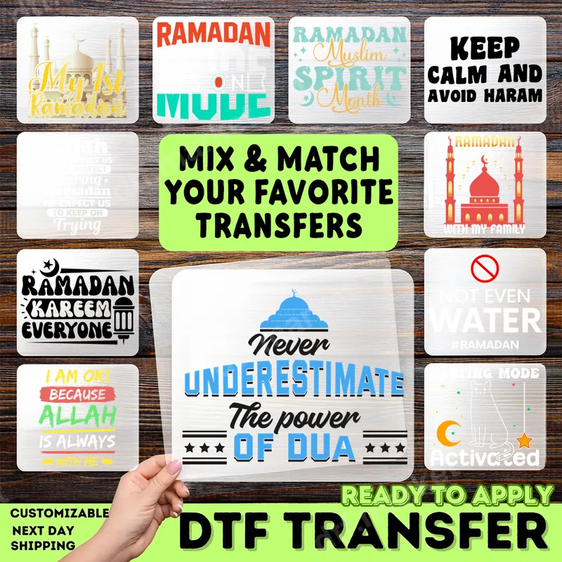 See allEmbrace the profound message of spiritual strength with our 'Never Underestimate The Power of Dua' DTF transfer. This inspiring design features bold typography complemented by a serene mosque silhouette, symbolizing prayer and devotion. It's a powerful statement piece, expertly crafted as a premium DTF transfer, designed to inspire faith and commitment. This ready to press design ensures vibrant colors and crisp details, bringing your spiritual message to life on any garment. This powerful heat press transfer is ideal for devout Muslims, individuals observing Ramadan, or anyone seeking to express their faith. It makes a thoughtful and meaningful gift for family, friends, or community members for special occasions like Eid al-Fitr, Eid al-Adha, or as an everyday reminder of spiritual reliance. Perfect for Islamic events, gatherings, or simply for personal wear to carry a message of hope and strength. Applying this iron on transfer is incredibly simple and requires no weeding. It’s compatible with a wide range of fabrics, including cotton, polyester, and various blends, making it a versatile choice for your crafting needs. For best results, use a heat press set between 300-325°F for 15 seconds with medium pressure. Even a strong household iron can achieve great results, allowing everyone to create custom apparel effortlessly. Our direct to film transfer is crafted using professional-grade DTF film, guaranteeing a high-quality finish that is both vibrant and durable. Enjoy a soft hand feel that won't crack, peel, or fade, even after multiple washes. This professional apparel transfer ensures your designs stand out with lasting brilliance, providing a superior alternative to traditional vinyl transfers.
