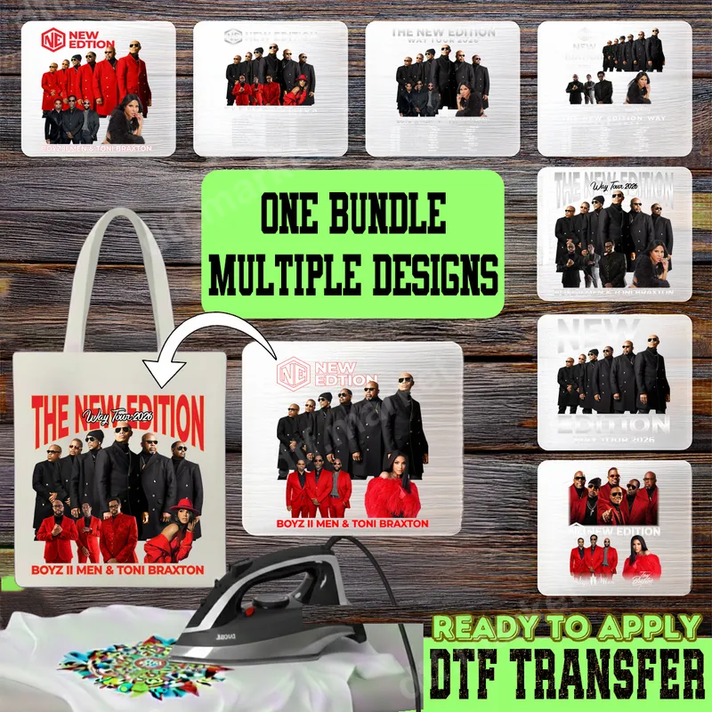 See allDive into the golden era of R&B with this exclusive New Edition, Boyz II Men, and Toni Braxton DTF transfer bundle. Featuring multiple dynamic designs inspired by "The New Edition Way Tour 2026," this collection brings together iconic imagery of these legendary artists. Each design is a premium, ready to press DTF transfer, making it effortless to add a touch of musical nostalgia to your wardrobe or accessories. Celebrate your favorite R&B groups and artists with vibrant, high-quality prints that capture their timeless style. This unique heat press transfer bundle is perfect for dedicated fans of New Edition, Boyz II Men, and Toni Braxton. Whether you're attending a concert, reliving classic R&B moments, or simply want to showcase your musical taste, these designs are ideal. They make fantastic gifts for birthdays, anniversaries, or any special occasion for the R&B enthusiast in your life. Create personalized apparel for yourself or friends, ensuring you stand out with these legendary music icons. Applying these vibrant apparel transfers is a breeze. Our high-quality iron on transfers work perfectly on a wide range of materials, including cotton, polyester, and various fabric blends. For best results, use a heat press at 300-325°F for 15 seconds with medium pressure, then cold peel. A household iron can also be used with care, ensuring even heat and pressure. Forget tedious weeding or layering – these ready to press transfers offer a quick, professional finish every time. Experience unparalleled quality with every custom transfer from dtf.market. Our DTF transfers are renowned for their vibrant colors, exceptional durability, and soft-to-the-touch feel, ensuring your designs look stunning and last through countless washes without cracking or fading. Printed on professional-grade DTF film with a strong, reliable adhesive, these designs are engineered for a flawless application and long-lasting wear, giving your garments a professional, retail-ready finish.