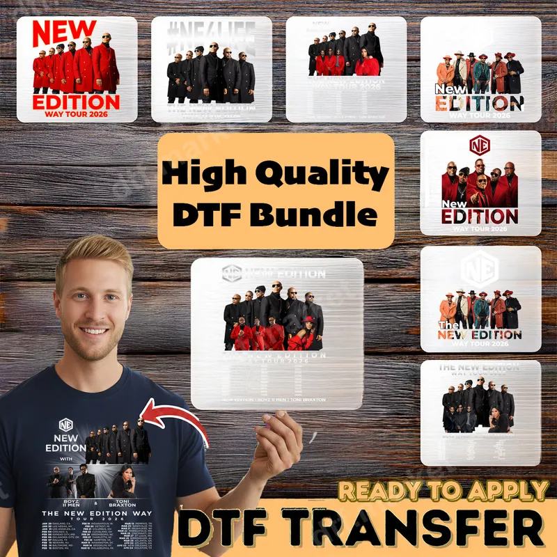 See allCelebrate the iconic sound of New Edition with this exclusive 'The New Edition Way Tour 2026' DTF transfer bundle! Featuring dynamic designs showcasing the legendary group, along with their special guests Boyz II Men and Toni Braxton, these graphics capture the energy of their highly anticipated concert series. Each design is a high-quality DTF transfer, completely ready to press onto your favorite garments, allowing you to create personalized fan apparel or memorable gifts. The collection includes various styles with tour date listings and classic New Edition imagery, making it perfect for dedicated fans. This New Edition tour design collection is a must-have for any devoted R&B music enthusiast or concert-goer. Ideal for creating custom t-shirts, hoodies, or tote bags to wear to 'The New Edition Way Tour 2026' or simply to show your love for the legendary group. It also makes a fantastic, unique gift for birthdays, anniversaries, or any special occasion for someone who grew up with their hits. Perfect for those who appreciate 80s and 90s R&B nostalgia and want to keep the spirit of classic music alive. Applying your New Edition heat press transfer is incredibly simple and requires no weeding, unlike traditional vinyl. These premium heat press designs work seamlessly on a wide range of fabrics, including 100% cotton, polyester, and various blends. For best results, use a heat press at 300-325°F for 15 seconds with medium pressure, then a cold peel. A household iron can also be used with care, ensuring even pressure. Full instructions will be provided, making it easy for anyone to create professional-looking apparel. Experience superior quality with every apparel transfer. Our New Edition designs are printed using state-of-the-art DTF technology, ensuring vibrant colors that pop and sharp details that last. The transfers are exceptionally durable, crack-resistant, and feature a soft-hand feel, becoming one with the fabric rather than feeling like a heavy layer. Crafted on professional-grade DTF film with a strong, reliable adhesive, these transfers are built to withstand countless washes while maintaining their original brilliance.