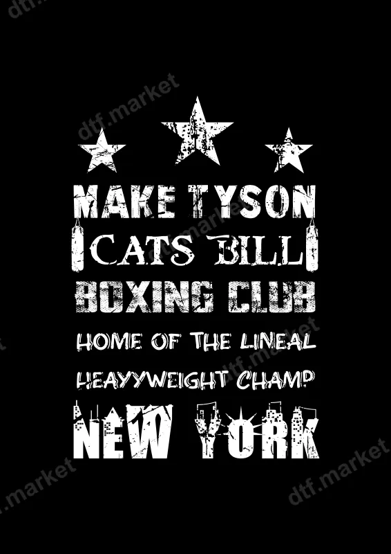 See allThis "Make Tyson Cats Bill Boxing Club" DTF transfer brings a powerful, vintage boxing aesthetic to any garment. Featuring bold, distressed white lettering against a black background, the design proudly declares "HOME OF THE LINEAL HEAVYWEIGHT CHAMP" and prominently displays "NEW YORK" with iconic skyline elements. Three gritty stars and a subtle punching bag graphic complete this ready to press design, making it ideal for those who appreciate old-school boxing heritage and urban grit. Perfect for die-hard boxing fans, New York City enthusiasts, and anyone who loves a rugged, retro sports look. This versatile design makes an excellent gift for dads, brothers, or friends who frequent the gym, follow boxing legends, or simply enjoy unique streetwear. Customize apparel for casual wear, gym sessions, or to show off your love for the fight game. It’s a fantastic choice for birthdays, Father's Day, or just to elevate your everyday style. Our premium DTF transfer is incredibly easy to apply, allowing you to create custom apparel in minutes. Simply use a heat press at 300-325°F for 15 seconds with medium pressure, or follow instructions for a household iron. This durable iron on transfer adheres perfectly to a wide range of materials, including cotton, polyester, and their blends, making it a versatile heat transfer for all your creative projects. Best of all, there's absolutely no weeding required, saving you time and effort. Experience professional-grade quality with every "Make Tyson Cats Bill Boxing Club" t-shirt transfer. Our direct to film transfers boast vibrant colors, exceptional durability, and a soft-to-the-touch feel that won't crack or peel. Crafted using high-quality DTF film and strong adhesive, this apparel transfer ensures your custom creations look fantastic and last wash after wash. Transform ordinary garments into extraordinary statements with our reliable, long-lasting designs.