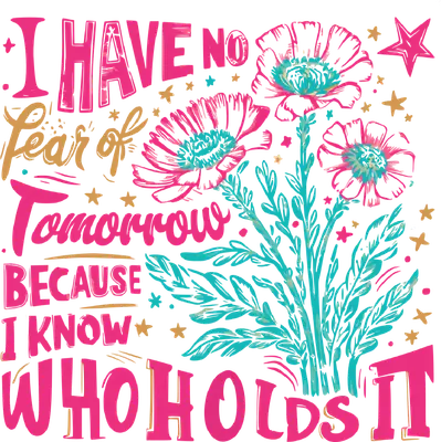 Discover a powerful message of faith and hope with this vibrant "I HAVE NO Fear of Tomorrow BECAUSE I KNOW WHO HOLDS IT" DTF transfer. This beautifully designed piece features hand-drawn style typography in hot pink and gold, complemented by striking teal and pink stylized flowers, surrounded by playful stars. It's an uplifting design, ready to press, that brings a burst of color and encouragement to any garment. This inspirational design is perfect for Christian women, youth group members, or anyone seeking a constant reminder of divine assurance. It makes a thoughtful gift for birthdays, religious milestones, or simply to uplift a friend. Small Etsy t-shirt sellers and boutique owners will find this an appealing addition to their faith-based apparel lines. Apply this unique iron on transfer to create custom apparel for church events, conferences, or everyday wear. Our premium heat press transfer works seamlessly on a wide range of fabrics including cotton, polyester, cotton-poly blends, and even nylon. Application is simple: use a heat press at 300-325°F for 15 seconds with medium pressure, or a household iron. There's no tedious weeding required—just peel and press for instant results. This versatile design is ideal for custom t-shirts, cozy hoodies, sweatshirts, practical tote bags, decorative pillow covers, and even stylish denim jackets. For lasting durability, wash garments inside out and tumble dry on low. Experience exceptional quality with this ready to press transfer, showcasing vibrant, full-color printing and intricate fine details. The design is crack-resistant and boasts a soft, lightweight feel, unlike heavy vinyl. Each direct to film transfer is meticulously printed on premium DTF film with a strong adhesive backing, ensuring a professional and long-lasting finish every time.
