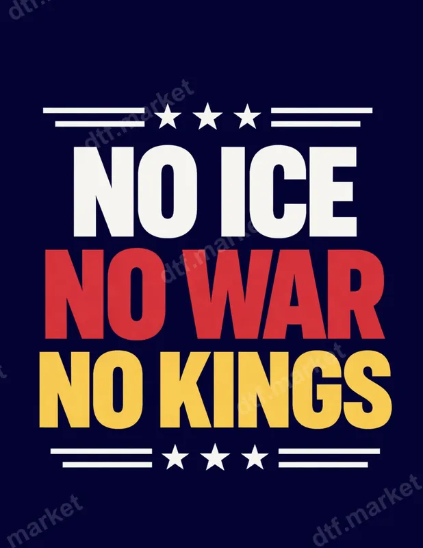 See allThis striking 'No ICE No War No Kings' DTF transfer delivers a powerful message of protest and resistance, featuring bold white, red, and yellow text on a deep navy background. The design is framed with stylized stars and stripes accents, invoking a sense of democratic defiance and American principles of freedom. This ready to press transfer is perfect for expressing strong social and political viewpoints on your apparel and accessories. Ideal for activists, human rights advocates, and anyone who believes in challenging the status quo, this design is a must-have for expressing your convictions. Wear it to rallies, peaceful protests, political gatherings, or simply as a daily statement of your values. It also makes a thoughtful and impactful gift for friends and family who are passionate about social justice, freedom, and governmental accountability, allowing them to create custom apparel with ease. Applying this vibrant heat transfer is straightforward and hassle-free. Our direct to film transfers adhere beautifully to a wide range of fabrics, including cotton, polyester, and their blends. For best results, use a heat press at 280-300°F for 6-10 seconds with medium pressure, then peel instantly. This iron on transfer also works well with a household iron. Enjoy the convenience of a ready-to-apply design with no weeding or intricate layering required. Crafted using professional-grade DTF film, this apparel transfer boasts exceptional color vibrancy and durability. The design is soft to the touch, flexible, and crack-resistant, ensuring it looks great and lasts wash after wash. The strong adhesive ensures a secure bond to your garments, providing a high-quality finish that stands out. Elevate your wardrobe with a durable and impactful shirt design that makes a lasting statement.