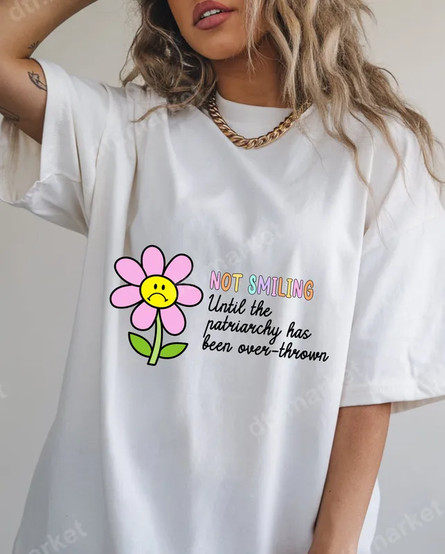 See allExpress your feminist spirit with our vibrant 'Not Smiling Until Patriarchy Overthrown' DTF transfer. This eye-catching design features a sweet pink flower with a sad face, contrasted with bold, colorful lettering for 'NOT SMILING' and a flowing script proclaiming 'Until the patriarchy has been over-thrown.' It's a perfect blend of cute retro aesthetics and a powerful social message, making it a unique ready to press design. This heat press design is ideal for activists, feminists, social justice advocates, or anyone with a sassy attitude. Perfect for rallies, casual wear, protest events, or as a thoughtful gift. Transform plain t-shirts, tote bags, or sweatshirts into powerful conversation starters that showcase your convictions and style. Our high-quality DTF transfers are incredibly versatile and user-friendly. They adhere beautifully to cotton, polyester, and various blends, ensuring your custom transfer looks fantastic. Applying this iron on decal is simple: use a heat press at 300-325°F for 15 seconds with medium pressure, or a household iron. Forget the tedious weeding process of traditional vinyl transfer; this design is ready to apply. Experience professional-grade results with every application. Our direct to film transfers boast vibrant colors that pop, superior crack resistance, and a soft, lightweight feel that integrates seamlessly with your fabric. Crafted using premium DTF film and strong adhesive, these apparel transfers are designed for long-lasting wear and countless washes, ensuring your powerful message stays clear and impactful.