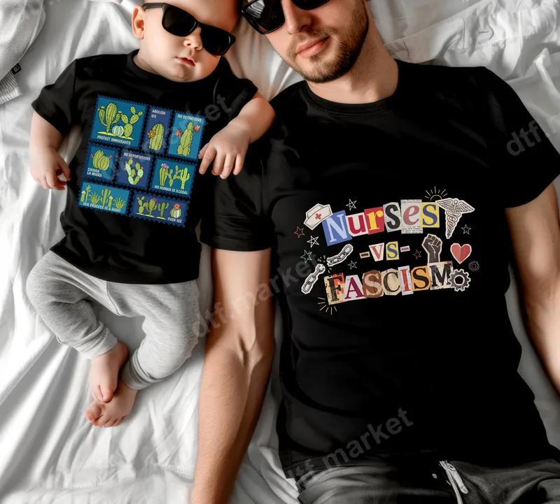 See allMake a powerful statement with our 'Nurses VS Fascism' DTF transfer. This striking design features a collage-style typography with fragmented letters, surrounded by impactful symbols like a nurse's cap, caduceus, a raised fist, and a broken chain. It's a visually compelling and politically charged direct to film transfer, perfectly ready to press onto your favorite garments and accessories. This ready to press design is ideal for nurses, healthcare professionals, activists, and anyone who stands for social justice and human rights. Wear it to rallies, protests, or as an everyday statement piece to express your solidarity and commitment to anti-fascist principles. It makes a thoughtful and empowering gift for the healthcare hero in your life who isn't afraid to speak their mind. Applying this heat press transfer is simple and efficient. It works seamlessly on a wide range of materials including cotton, polyester, and blends. For best results, use a heat press at 300-325°F for 15 seconds with medium pressure. It can also be applied with a household iron with careful attention. Say goodbye to tedious weeding – this iron on decal comes completely prepped and ready for immediate application. Experience professional-grade quality with every t-shirt transfer. Our DTF transfers are known for their vibrant colors, exceptional durability, and soft-to-the-touch finish. They are crack-resistant and designed to withstand numerous washes, ensuring your powerful message remains clear and bold for years to come. Each transfer uses premium film and strong adhesive for a flawless application.