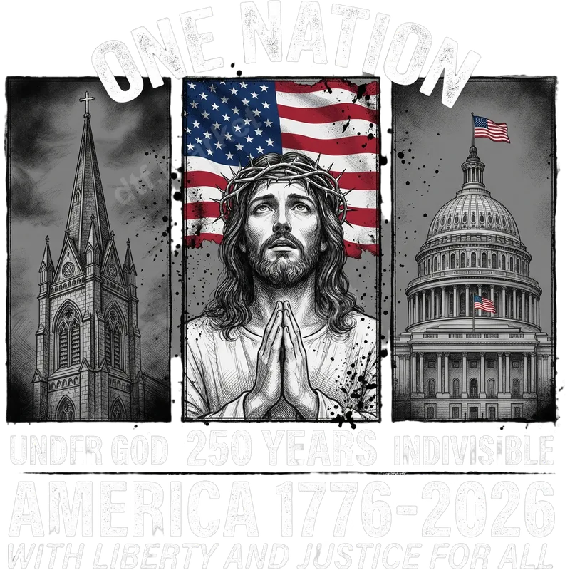 See allThis powerful 'One Nation Under God' DTF transfer features a striking depiction of Jesus, crowned with thorns and hands clasped in prayer, set against a distressed American flag. Flanked by a grand church steeple and the iconic US Capitol building, the design is framed by the impactful text 'ONE NATION UNDER GOD 250 YEARS INDIVISIBLE AMERICA 1776-2026 WITH LIBERTY AND JUSTICE FOR ALL'. This ready to press design beautifully combines deep faith with strong American patriotism, making a profound statement on any apparel. Perfect for patriotic Americans who cherish their Christian faith, this design is ideal for expressing devotion to both God and country. It makes a meaningful heat transfer for personal apparel, special church events, or national holidays like the Fourth of July, Memorial Day, and Veterans Day. This unique iron on decal is also a thoughtful gift for veterans, service members, and anyone proud to celebrate America's 250th anniversary with a message of faith and unity. Our direct to film transfers are incredibly versatile and easy to apply. They work seamlessly on a wide range of fabrics, including 100% cotton, 100% polyester, and cotton-poly blends. For best results, use a heat press at 300-325°F for 15 seconds with medium pressure, followed by a cool peel. While a heat press is recommended for professional results, this high-quality heat press design can also be applied with a household iron with careful attention. No weeding or complicated layering required! Experience vibrant, durable, and crack-resistant results with our professional-grade DTF film. Each apparel transfer is crafted to be soft to the touch, ensuring comfort while maintaining exceptional detail and color fidelity even after multiple washes. Trust dtf.market for premium heat press ready transfers that stand the test of time and proudly display your message.
