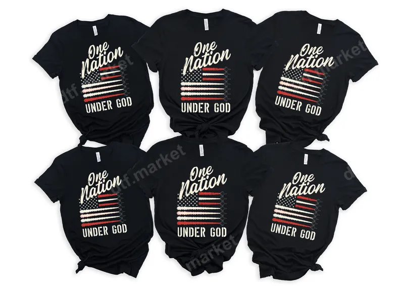 See allThis powerful DTF transfer proudly displays the message 'One Nation Under God,' featuring a rustic, distressed American flag design. The artistic blend of a flowing script for 'One Nation' and a bold, textured font for 'UNDER GOD' creates a vintage yet timeless patriotic look. This ready to press design is perfect for anyone wanting to express their national pride and faith. Ideal for patriots, church groups, veterans, and anyone who cherishes both their country and their faith. This heat press design is perfect for Fourth of July celebrations, Memorial Day, Veterans Day, or everyday wear to express your beliefs. It makes a thoughtful gift for family, friends, or fellow congregation members, suitable for creating custom apparel for rallies, events, or casual outings. Applying this direct to film transfer is effortless, suitable for a wide range of materials including cotton, polyester, and their blends. For best results, use a heat press at 300-325°F for 15 seconds with medium pressure. It can also be applied with a household iron with firm, even pressure. Unlike traditional vinyl transfer, there's no weeding required, making custom garment creation quick and simple. Experience professional-grade quality with this apparel transfer. Our DTF transfers are known for their vibrant colors, exceptional durability, and soft-to-the-touch feel, ensuring your design looks great and lasts wash after wash. The strong adhesive ensures a secure bond to your chosen garment, resisting cracking and peeling, giving you a high-quality finish every time.