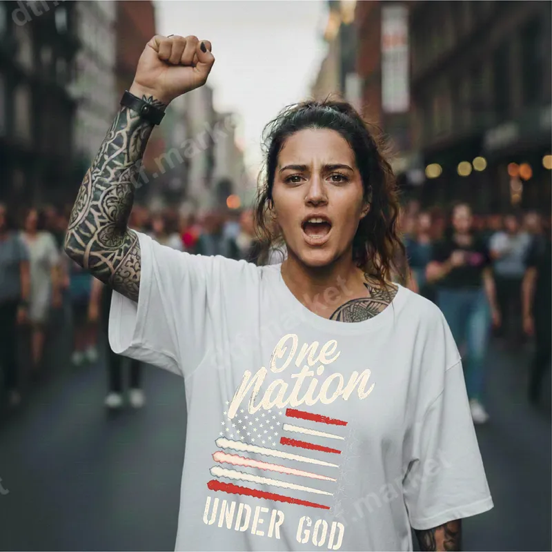 See allThis impactful DTF transfer features the powerful phrase "One Nation UNDER GOD" emblazoned over a stylishly distressed American flag design. The vintage, worn look of the flag stripes and subtle star pattern adds a unique character, making this a standout patriotic heat transfer. It’s a bold statement piece, combining national pride with a deep sense of faith, perfect for anyone looking to express their beliefs. This design is printed as a vibrant, ready to press transfer, ensuring a professional finish. Ideal for patriots, individuals of faith, and those who cherish American values, this versatile heat press design is perfect for numerous occasions. Celebrate national holidays like the 4th of July or Memorial Day, express your stance at rallies, or simply wear your beliefs proudly every day. It makes a thoughtful gift for veterans, church members, family, and friends who share a love for country and God. Transform ordinary apparel into powerful statements with this meaningful design. Our premium direct to film transfer is designed for easy application on a wide range of materials, including cotton, polyester, and various fabric blends. For best results, apply with a heat press at 300-325°F for 15 seconds with medium pressure, then cold peel. While a heat press is recommended for professional results, this durable iron on transfer can also be applied using a household iron with firm, even pressure. Enjoy a seamless creation process with no weeding required. Crafted with high-quality inks and professional DTF film, this apparel transfer ensures vibrant colors that resist cracking and fading, even after multiple washes. The strong adhesive guarantees excellent durability, bonding securely to your chosen garment for a soft, flexible finish that feels like part of the fabric. Experience professional-grade results and long-lasting wear with every heat press ready design from dtf.market.
