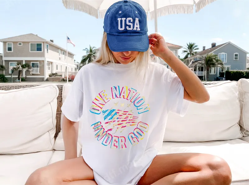 See allShow your patriotic spirit and faith with this vibrant 'One Nation Under God' DTF transfer. The design features bold, distressed lettering arched over a stylized, distressed American flag, presented in a vivid, almost neon color palette of pink, blue, and yellow. This eye-catching ready to press design combines modern aesthetics with a timeless message, perfect for making a statement. This inspiring heat transfer is ideal for anyone who cherishes their faith and country, making it a powerful choice for patriotic events like the 4th of July, Memorial Day, or everyday wear. It’s also a thoughtful gift for veterans, service members, or anyone proud of their American heritage and Christian beliefs. Create custom apparel for church groups, family gatherings, or community celebrations with ease. Applying your new design is simple and hassle-free. Our premium DTF transfers work beautifully on a wide range of fabrics including cotton, polyester, and various blends, offering incredible versatility. For best results, use a heat press at 300-325°F for 15 seconds with medium pressure, then cold peel. For smaller projects, a household iron can also be used. Enjoy a professional finish with no weeding required, unlike traditional vinyl transfers. Experience superior quality with every iron on transfer. Our designs boast vibrant, long-lasting colors that resist cracking and fading, ensuring your customized t-shirt transfer looks great wash after wash. The professional-grade DTF film provides a soft, flexible feel that seamlessly integrates with your garment, offering exceptional durability and a smooth finish. Elevate your apparel with a high-quality, ready to press design that truly stands out.