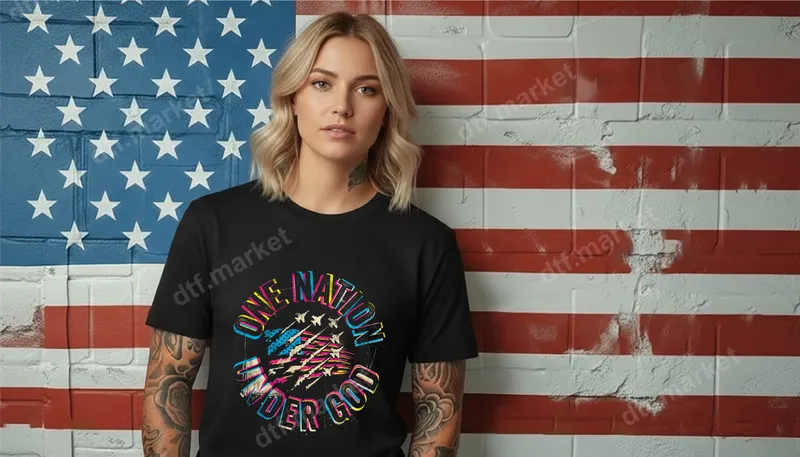 See allThis striking design features the powerful phrase "One Nation Under God" encircling a dynamic, distressed American flag with soaring fighter jets. Rendered in a vibrant, modern color palette, this high-quality DTF transfer is an ideal way to express your patriotism and faith. It arrives ready to press, making customization quick and effortless for any apparel project. Perfect for proud Americans, veterans, military families, and those who cherish their faith, this design makes a bold statement. Apply this unique heat press transfer to commemorate national holidays like the 4th of July, Memorial Day, or Veterans Day. It's also an excellent choice for everyday wear or as a thoughtful gift for fellow patriots and community members. Our versatile iron on transfer is designed for easy application on a wide range of fabrics, including cotton, polyester, and their blends. For best results, use a heat press at 300-325°F for 15 seconds with medium pressure, ensuring a professional finish. This ready to press transfer requires no weeding, streamlining your garment customization process. Experience superior quality with this durable t-shirt transfer. Each design boasts vibrant, crack-resistant colors and a soft, smooth feel once applied. Our professional-grade DTF film features a strong adhesive, ensuring your custom creation lasts wash after wash. Transform your apparel with a design that stands out and truly endures.